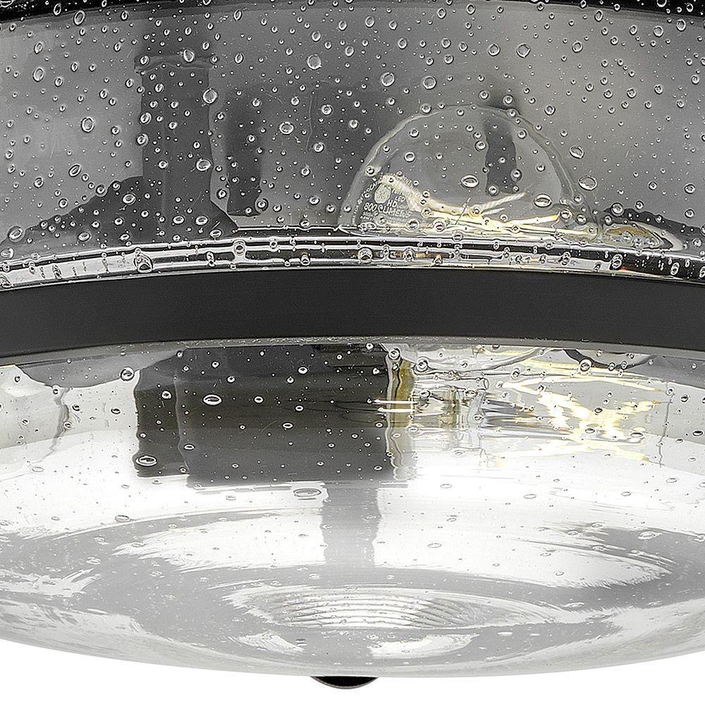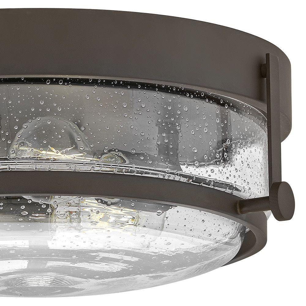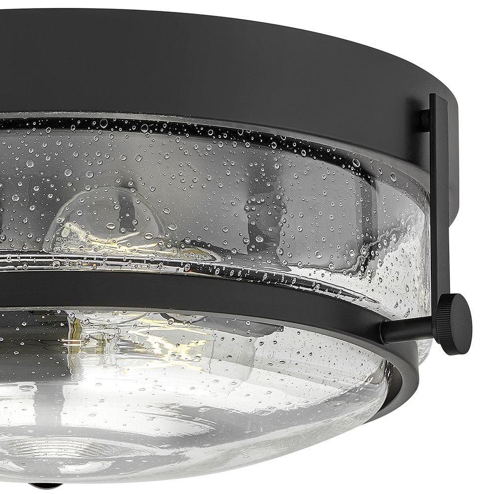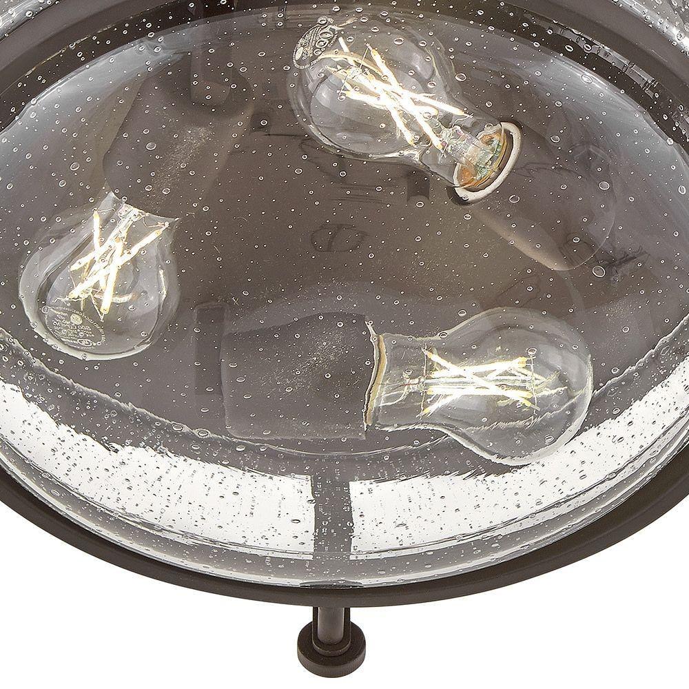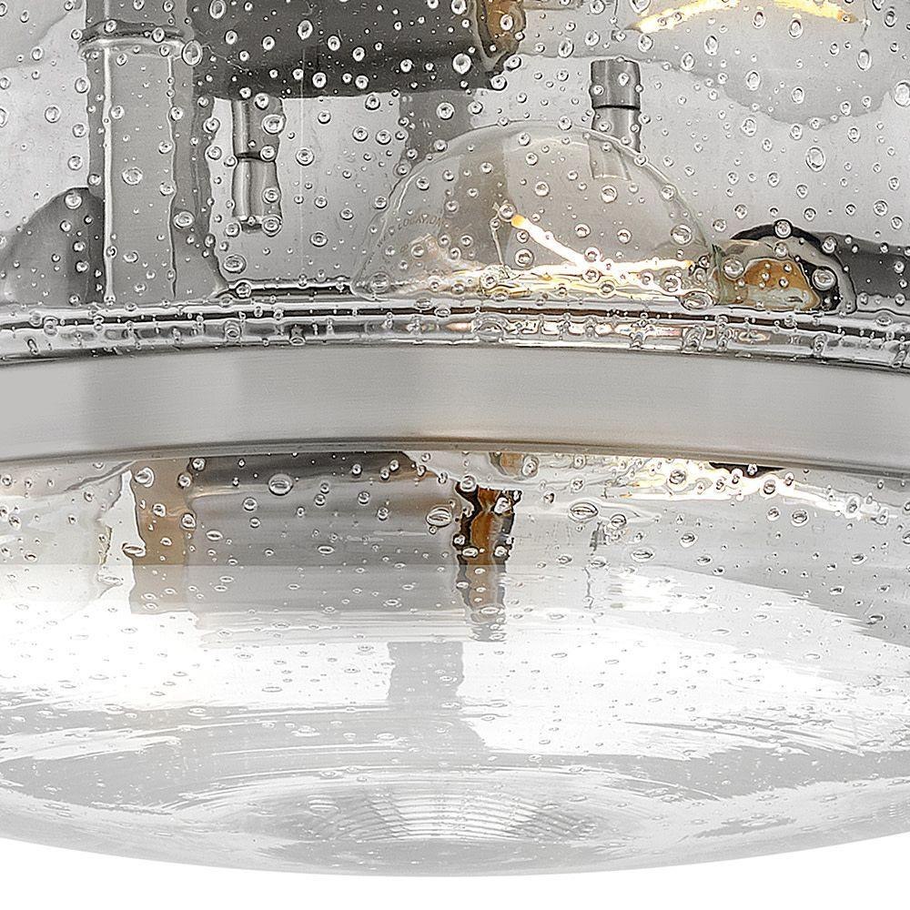 Harper’s sleek, retro design elevates the traditional ceiling mount with a unique clear seedy glass bound by a prominent metal ring and decorative knobs. Available in five classic finishes.