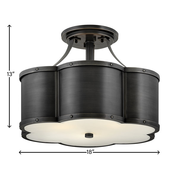 This Medium Semi-Flush Mount ceiling light features an aged Blackened Brass finish that creates a decorative depth with this captivating, contrasting look. Available in three different finishes, this version features a Blackened Brass metal shade with brushed Bright Brass accents. An etched lens diffuser is attached at the bottom to soften the glow from the (3) 12w Medium LED bulbs (not included).