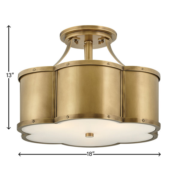 This Medium Semi-Flush Mount ceiling light features an aged Blackened Brass finish that creates a decorative depth with this captivating, contrasting look. Available in three different finishes, this version features a Blackened Brass metal shade with brushed Bright Brass accents. An etched lens diffuser is attached at the bottom to soften the glow from the (3) 12w Medium LED bulbs (not included).