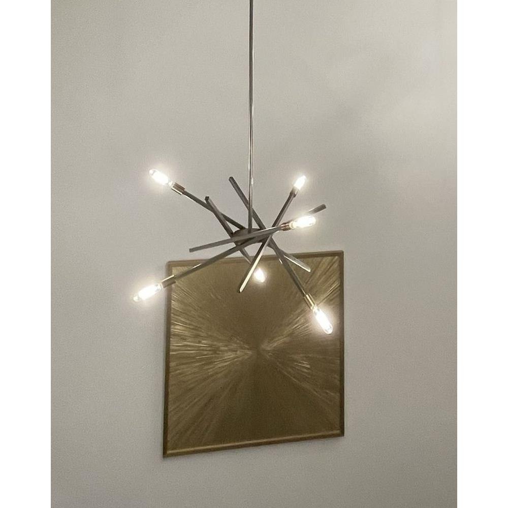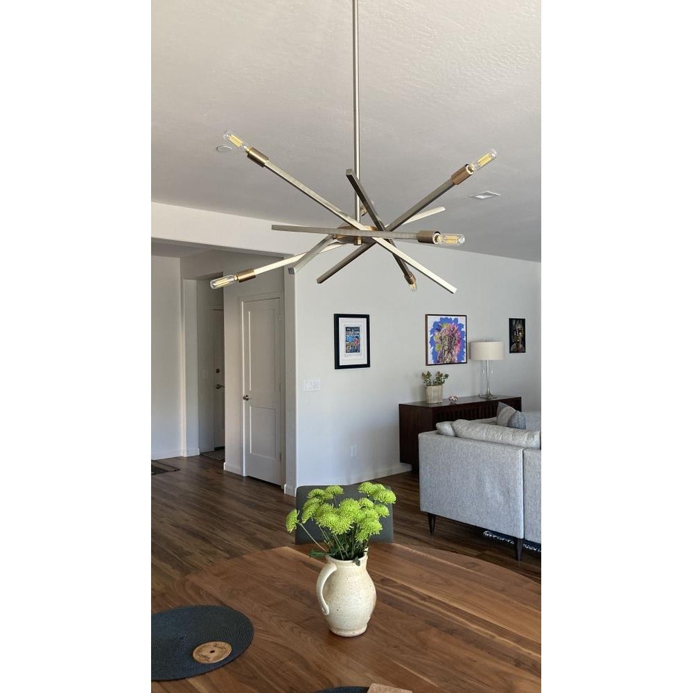 Suitable for use in dry (indoor) locations as defined by NEC and CEC. Meets United States UL Underwriters Laboratories & CSA Canadian Standards Association Product Safety Standards / This fixture includes multiple down stems in various lengths to customize the installation height of the fixture, including one 6" stem and two 12" stems. / Bold silhouette with dramatic details creates a modern statement / This stem hung fixture may be hung on a sloped ceiling / All dimensions listed are as shown. / Shown with T-style bulbs (not included) / Classic matte brushed nickel finish