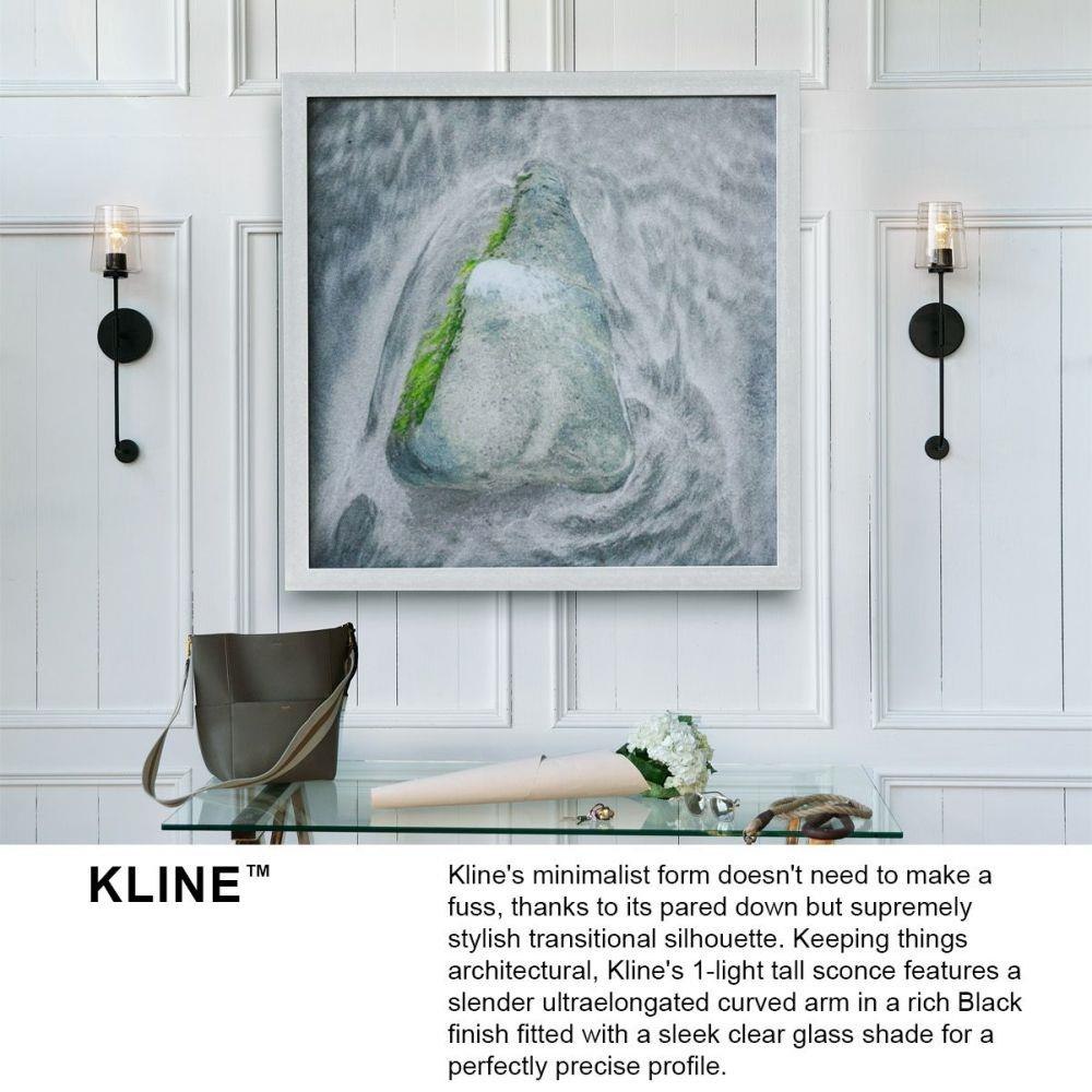 Kline’s minimalist form doesn’t need to make a fuss, thanks to its pared down but supremely stylish transitional silhouette. Keeping things architectural, Kline’s 1-light tall sconce features a slender ultra-elongated curved arm in a rich Black finish fitted with a sleek clear glass shade for a perfectly precise profile.