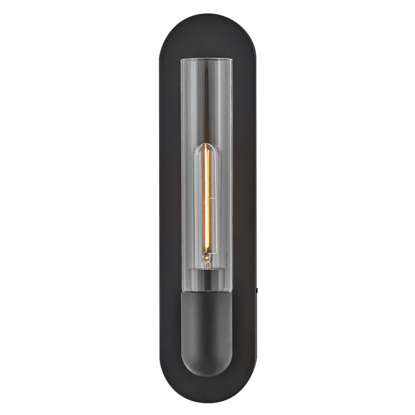Here we have a modern flush-mounted wall sconce that lends a stunning luxe vibe we love to any room in your home. It's crafted from steel with a solid finish, and it includes a crisp, thin silhouette that's ideal for cramped spaces. Still, it makes a big impact in hallways, living areas, and bedrooms. A clear glass cylinder shade surrounds a single bulb, which is sold separately and dimmable to move you effortlessly from day to night.
