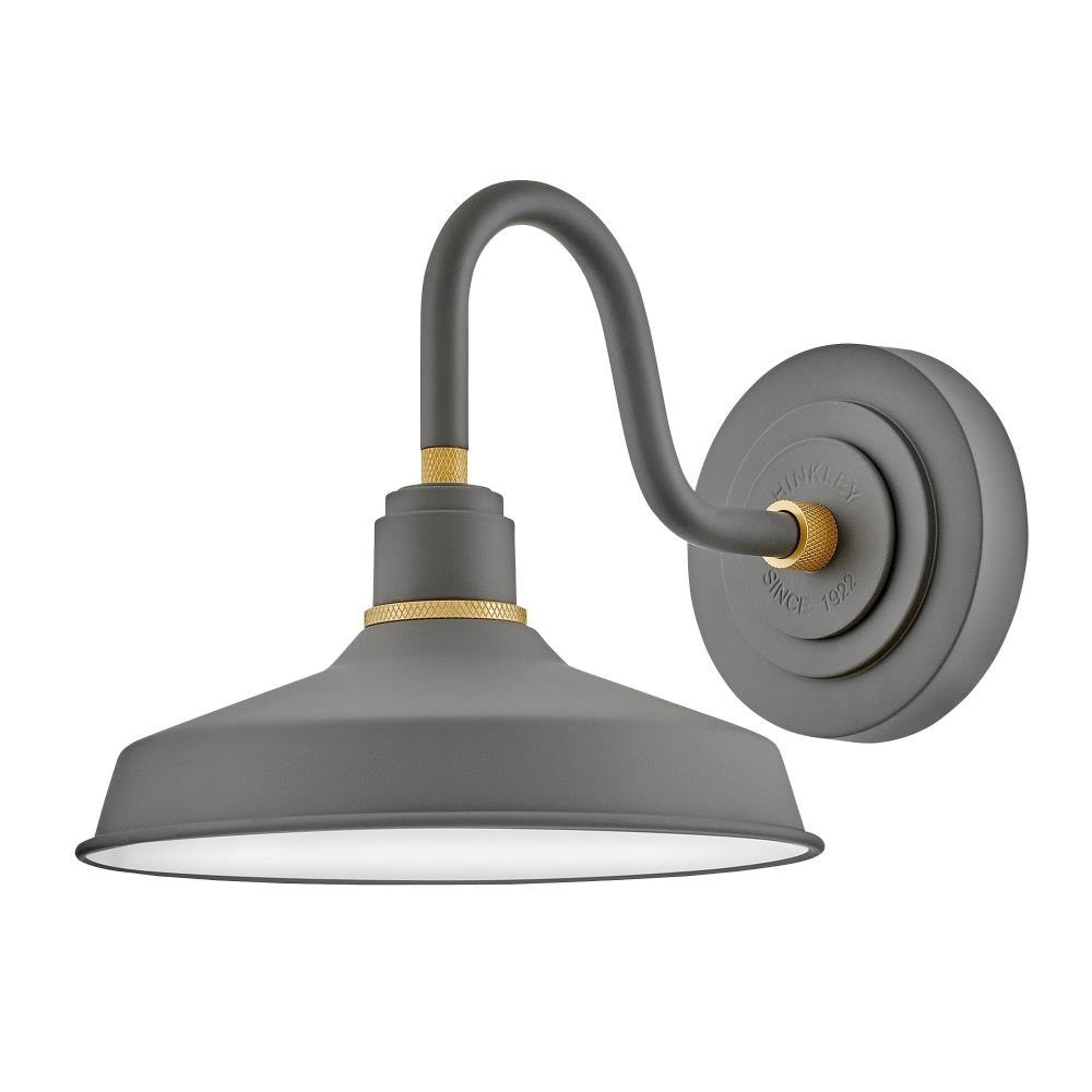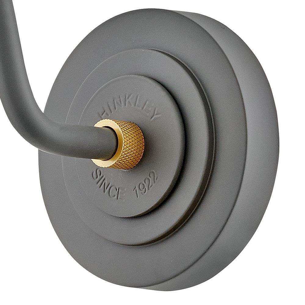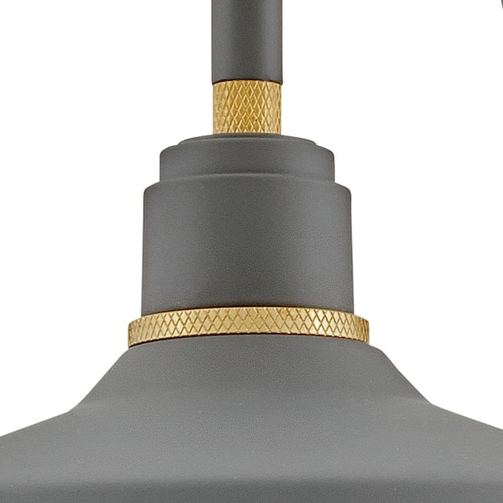 Decidedly industrious, Foundry reinvents purposeful lighting. Focused and direct, the sturdy aluminum shade features knurled brass details to offset a variety of finish options while casting a uniform light. The simple, understated form plants a vintage aesthetic for both inside and outside spaces while offering mix and match options that customize the look.Rich gray tone / Angular lines, a bold finish and robust details create an industrial edge to add flair to any type of façade / Suitable for use in wet (outdoor direct rain or sprinkler) locations as defined by NEC and CEC. Meets United States UL Underwriters Laboratories & CSA Canadian Standards Association Product Safety Standards / 2 year finish warranty / Fixture is Dark Sky compliant and engineered to minimize light glare upward into the night sky