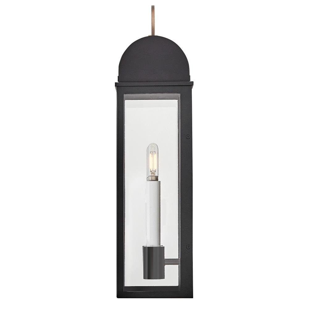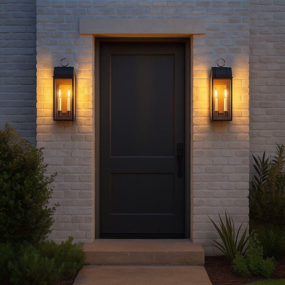 Inspired by traditional colonial lanterns, Campbell’s carriage house styling complements classic architecture accentuated by a bold arched roof and a cast top ring. Candelabra lamps with contrasting warm white candle sleeves are enhanced by a Black with Burnished Bronze finish and a reflective backplate.