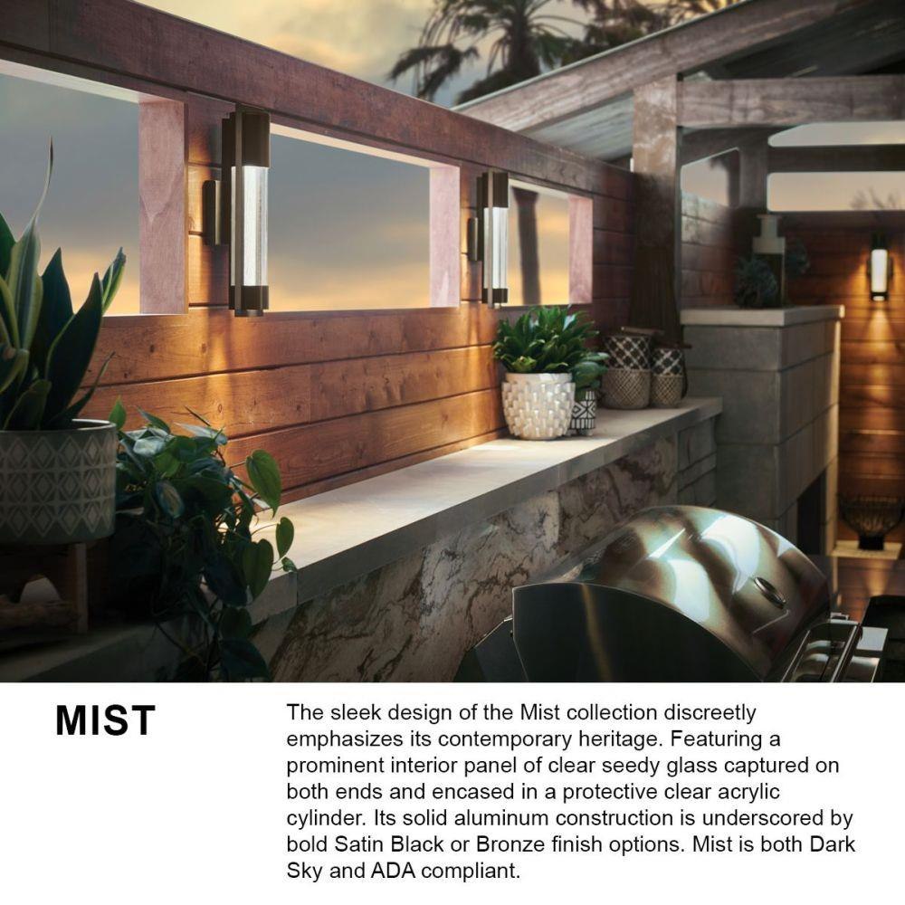 The sleek design of the Mist collection discreetly emphasizes its contemporary heritage. Featuring a prominent interior panel of clear seedy glass captured on both ends and encased in a protective clear acrylic cylinder. Its solid aluminum construction is underscored by bold finish options. Mist is both Dark Sky and ADA compliant.