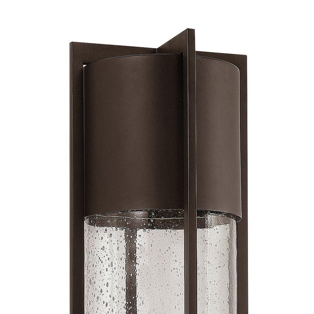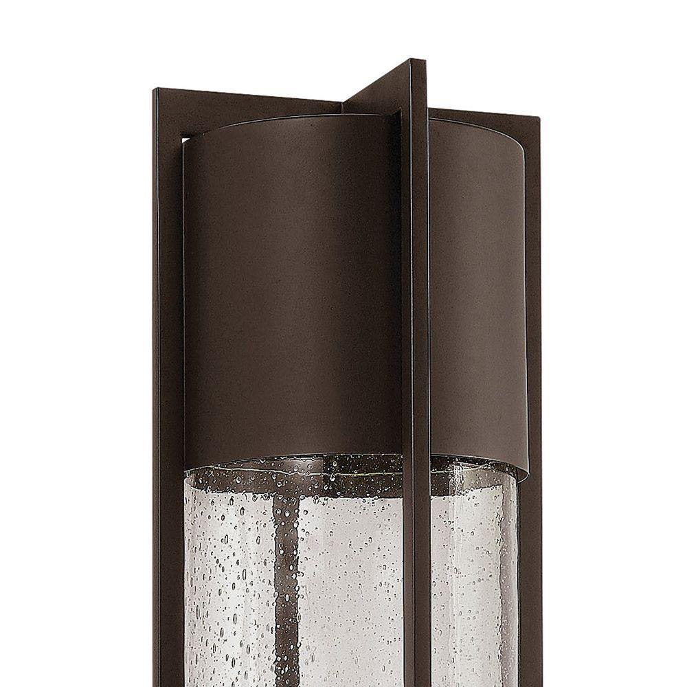 Shelter’s minimalist style in aluminum creates a chic, dramatic statement as the light from above grazes through its clear seedy glass. Shelter comes standard Dark Sky compliant.
