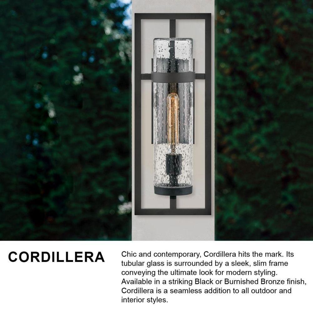 Chic and contemporary, Cordillera hits the mark. Its tubular glass is surrounded by a sleek, slim frame conveying the ultimate look for modern styling. Available in a striking Black or Burnished Bronze finish, Cordillera is a seamless addition to all outdoor and interior styles. Vintage style filaments are recommended to complete the statement look.