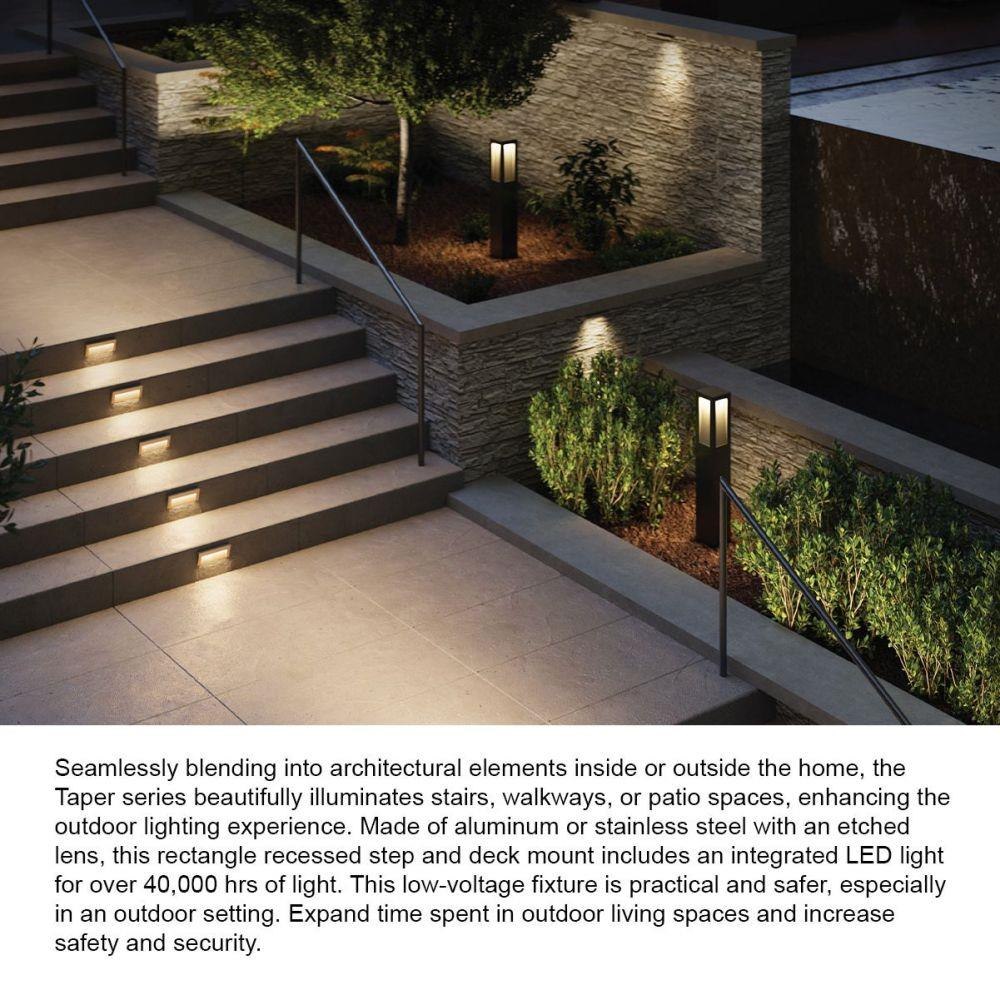 Designed for seamless integration into both indoor and outdoor architectural spaces, the 1563SK Taper LED step light provides a sophisticated lighting solution for stairs, walkways, and patios. Constructed from durable aluminum and equipped with an etched lens, this recessed fixture delivers a focused 160-lumen output through a single, integrated 1.9W LED. Its low-voltage operation enhances safety and energy efficiency, making it ideal for wet locations including direct exposure to rain or sprinklers, compliant with NEC and CEC standards.