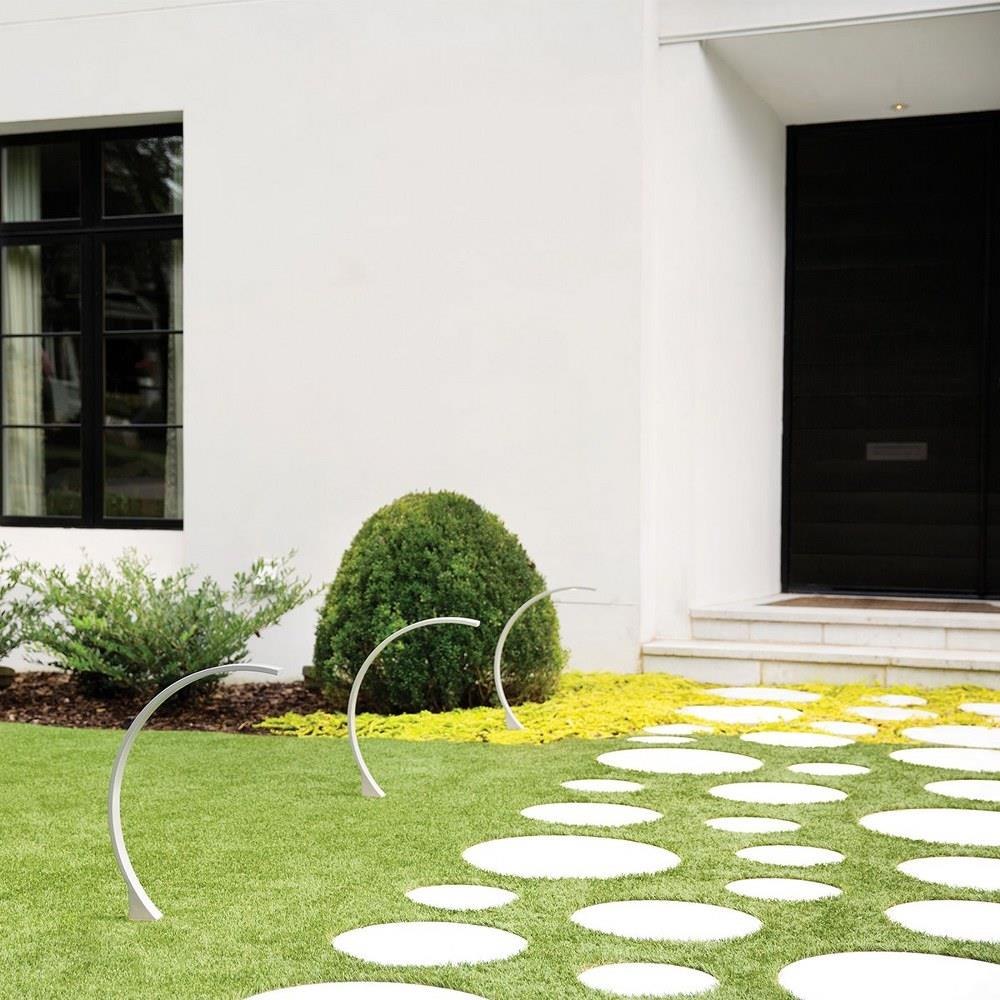 Designed for straightforward installation, the Arc path light includes a wiring kit and a ground spike, facilitating secure mounting in landscape environments. The unit is hardwired, providing a stable and permanent lighting solution. Its aluminum construction ensures durability against outdoor elements, while the etched glass shade enhances light diffusion and aesthetic appeal.
