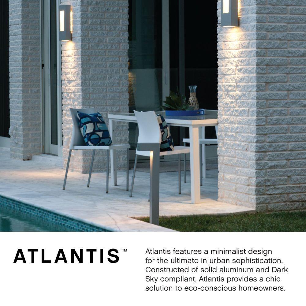 Atlantis features a minimalist design for the ultimate in urban sophistication. Constructed of solid aluminum and Dark Sky compliant, Atlantis provides a chic solution to eco-conscious homeowners, equipped with a universal driver in both the integrated LED and LED bulb base making this suitable for 120V and 277V applications.Rich gray tone / This fixture will cast light down. / LED components carry a 5-year limited warranty / Meets California Energy Commission 2013 & 2016 Title regulations/JA8 / Suitable for use in wet (outdoor direct rain or sprinkler) locations as defined by NEC and CEC. Meets United States UL Underwriters Laboratories & CSA Canadian Standards Association Product Safety Standards / 2 year finish warranty / Equipped with a 120/277 universal driver. 0-10 dimming. / Bold lines and a clean, minimalist style complement contemporary architecture / Fixture is Dark Sky compliant and engineered to minimize light glare upward into the night sky