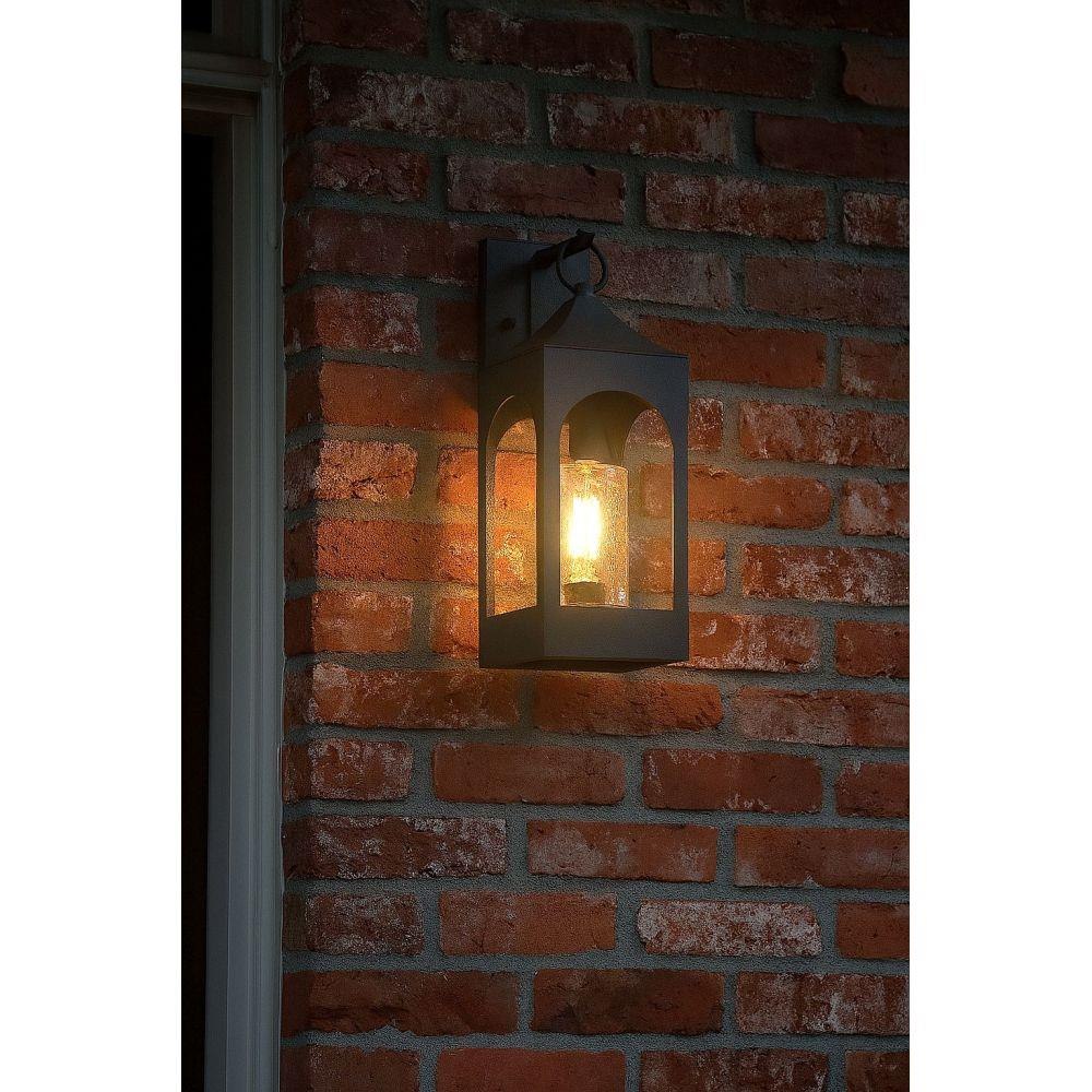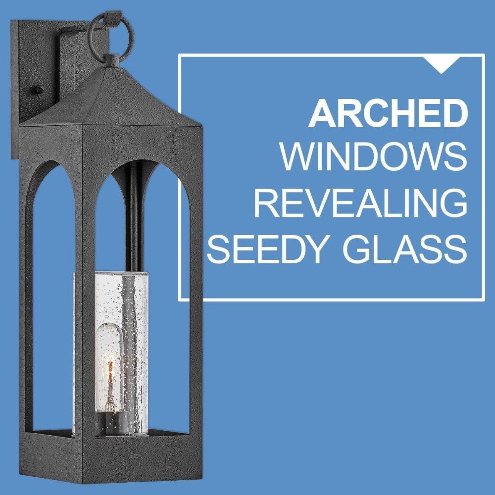 Amina is tradition with a flair. This lantern-inspired wall mount features dramatic, arched windows revealing a seedy glass that creates a faux candle effect. Constructed of durable aluminum in a Distressed Zinc finish, Amina is complete with an oversized loop reinforcing its timeless appeal.Rich gray tone / Suitable for use in wet (outdoor direct rain or sprinkler) locations as defined by NEC and CEC. Meets United States UL Underwriters Laboratories & CSA Canadian Standards Association Product Safety Standards / Classic lines and heritage details complement traditional architecture / 2 year finish warranty / Ideal for vintage filament bulbs (not included)