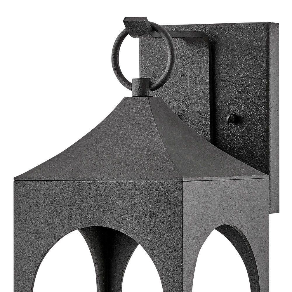 Amina is tradition with a flair. This lantern-inspired wall mount features dramatic, arched windows revealing a seedy glass that creates a faux candle effect. Constructed of durable aluminum in a Distressed Zinc finish, Amina is complete with an oversized loop reinforcing its timeless appeal.