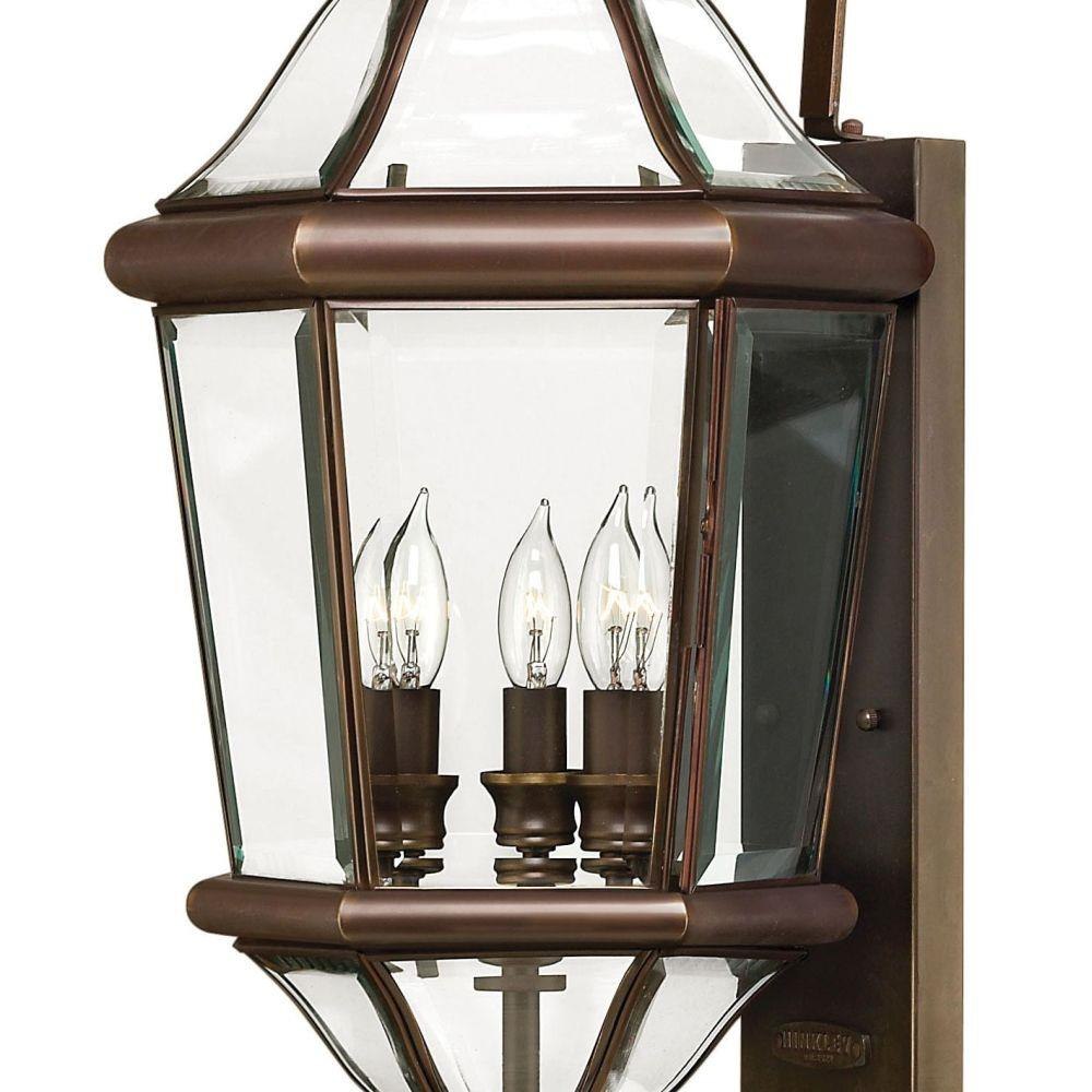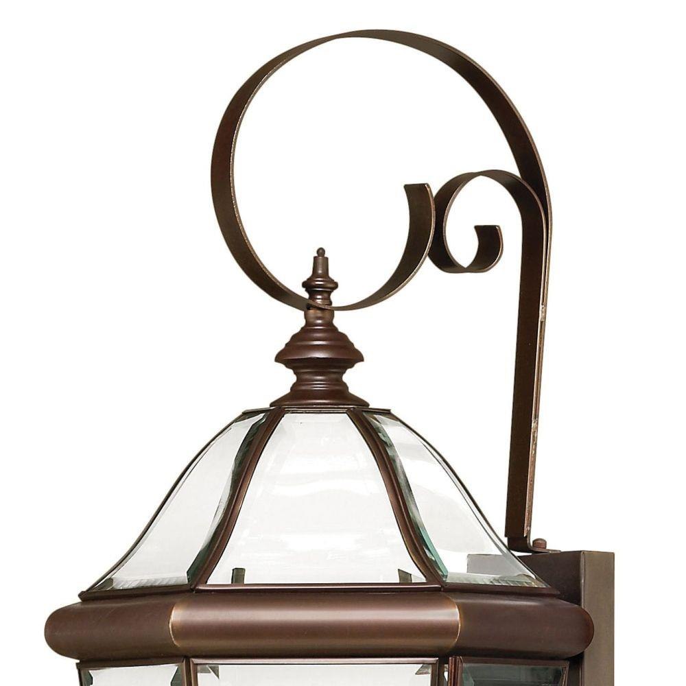 Augusta’s sophisticated beauty showcases its stylish clear bent, beveled and bound glass. Constructed in solid brass with a Copper Bronze finish, this classic traditional design also offers removable scrolls.Suitable for use in wet (outdoor direct rain or sprinkler) locations as defined by NEC and CEC. Meets United States UL Underwriters Laboratories & CSA Canadian Standards Association Product Safety Standards / Classic lines and heritage details complement traditional architecture / 2 year finish warranty / Bold and robust dark bronze finish