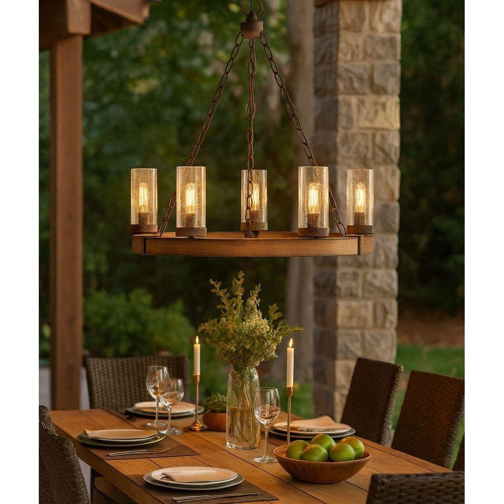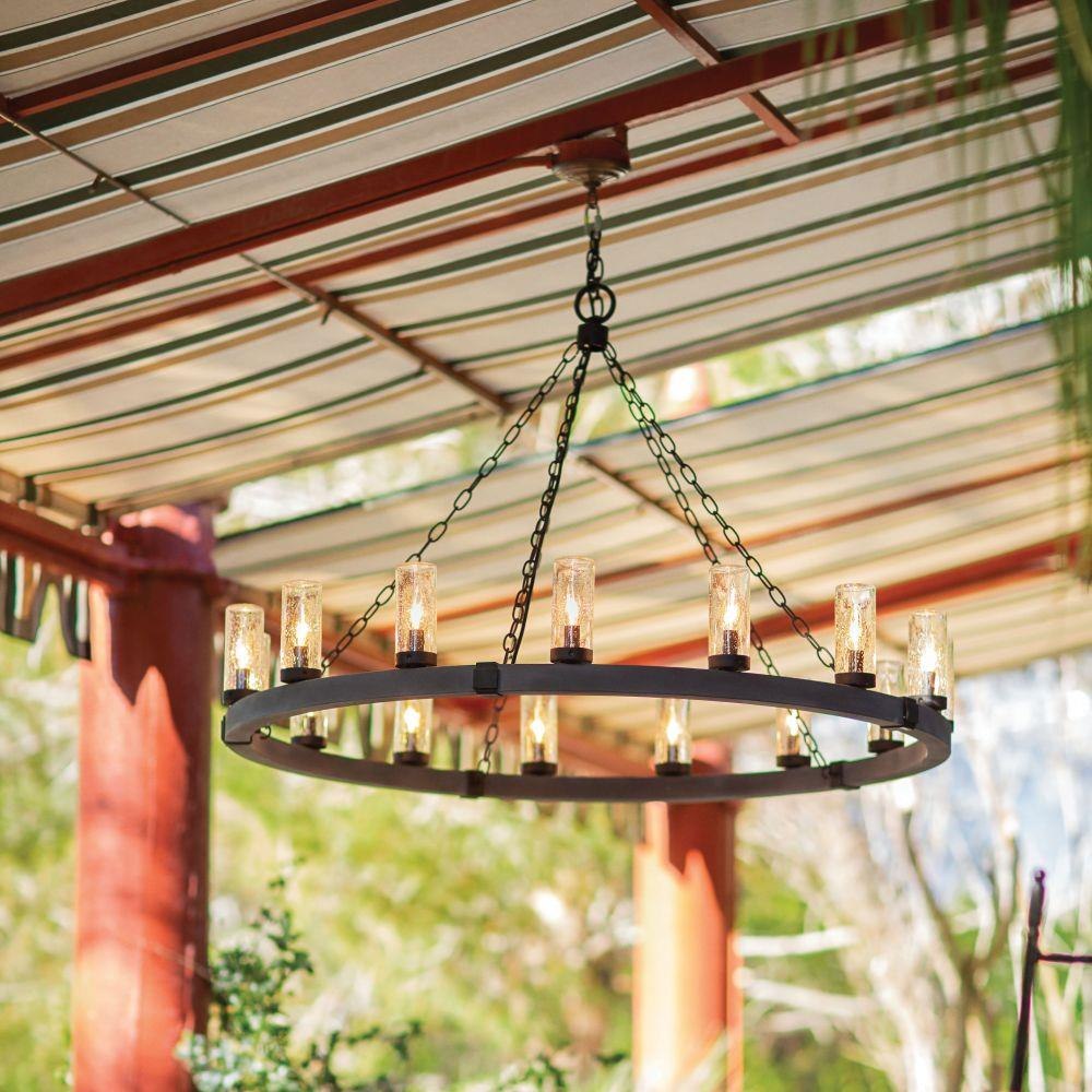 This chain or cable hung fixture may be installed on any sloped ceiling / Innovative Exterior 12-volt solution for all-in-one lamp, lighting and high design look. Transformer is required and sold separately. / Suitable for use in wet (outdoor direct rain or sprinkler) locations as defined by NEC and CEC. Meets United States UL Underwriters Laboratories & CSA Canadian Standards Association Product Safety Standards / Rustic elements with bold, refined details complement a variety of facades from farmhouse to contemporary architecture / The stylish Open Air collection includes outdoor-rated chandeliers, pendants and sconces that provide design-conscious solutions to a variety of exterior environments. / LED Bulbs carry a 3-year limited warranty / 12-volt LED vintage filament bulbs included / 2 year finish warranty / Images are for reference purpose only and may not be pictured with the specified LED filament bulb. / Variety of stylish fixtures customized with vintage filament bulbs / Rich rustic finish with a warm artisanal appearance / Offers low voltage semi-permanent solutions for unique areas such as pergolas when paired with low voltage Hinkley transformer