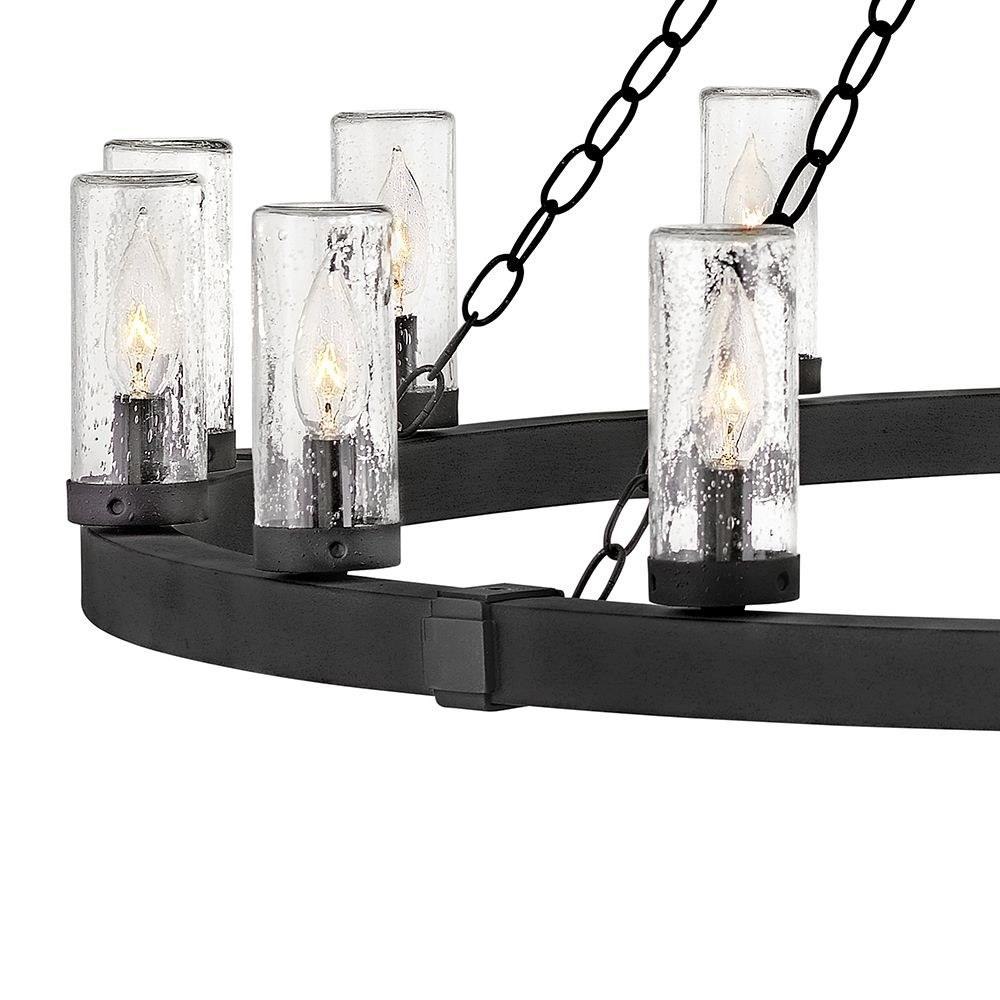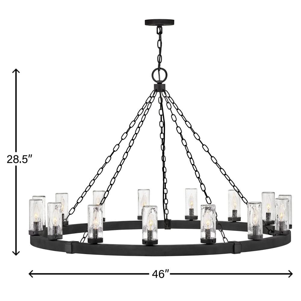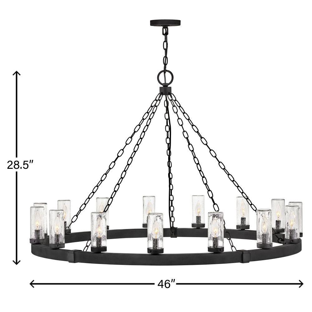 The fresh, rustic design of the Sawyer collection will inject any outdoor living experience with the warm, cozy ambiance of an indoor setting. Constructed with Hinkley's own anti-corrosion coating, Sawyer ensures maximum resiliency and performance in the elements.This chain or cable hung fixture may be installed on any sloped ceiling / Suitable for use in wet (outdoor direct rain or sprinkler) locations as defined by NEC and CEC. Meets United States UL Underwriters Laboratories & CSA Canadian Standards Association Product Safety Standards / Rustic elements with bold, refined details complement a variety of facades from farmhouse to contemporary architecture / The stylish Open Air collection includes outdoor-rated chandeliers, pendants and sconces that provide design-conscious solutions to a variety of exterior environments. / Striking black finish enhances design / 2 year finish warranty / Ideal for vintage filament bulbs (not included)