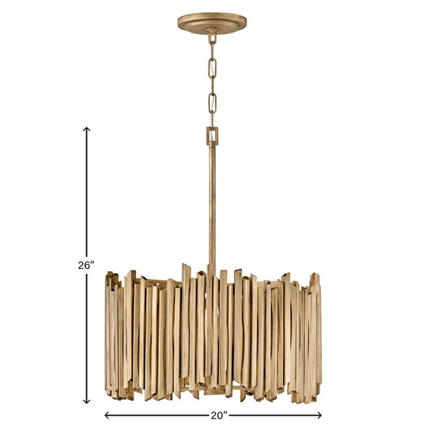 This Large Drum Chandelier is another striking work of sculptural innovation. Handmade, hand-painted metal square rods are individually affixed to the shade for an edgy, organic, one-of-a-kind sculptural silhouette. Illuminated by (3) 5w Candelabra LED bulbs (not included), this ceiling light can be hung on even or sloped ceilings from an adjustable 120-in chain. The light amber Burnished Gold finish has darker flecks for texture and depth.