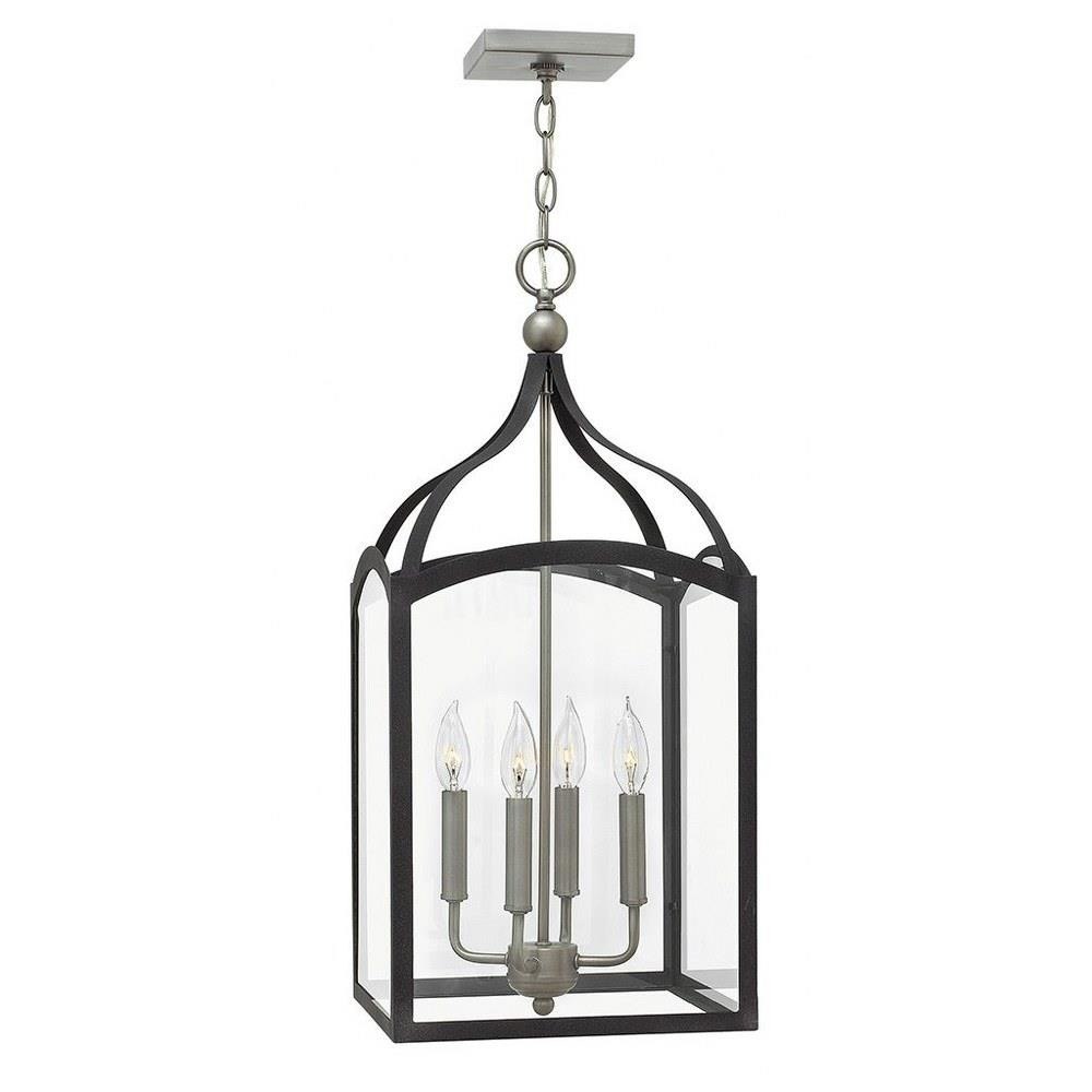 Clarendon is a classic four sided foyer lantern group designed in an elegant two tone finish and constructed in forged iron with cast ball details and clear glass panels. Clarendon is updated tradition at its finest.Suitable for use in dry (indoor) locations as defined by NEC and CEC. Meets United States UL Underwriters Laboratories & CSA Canadian Standards Association Product Safety Standards / This chain or cable hung fixture may be installed on any sloped ceiling / Rich gray tone / Classic, elegant lines and timeless details enhance a traditional space