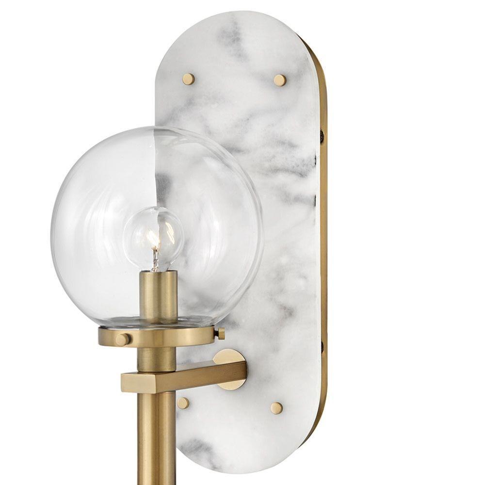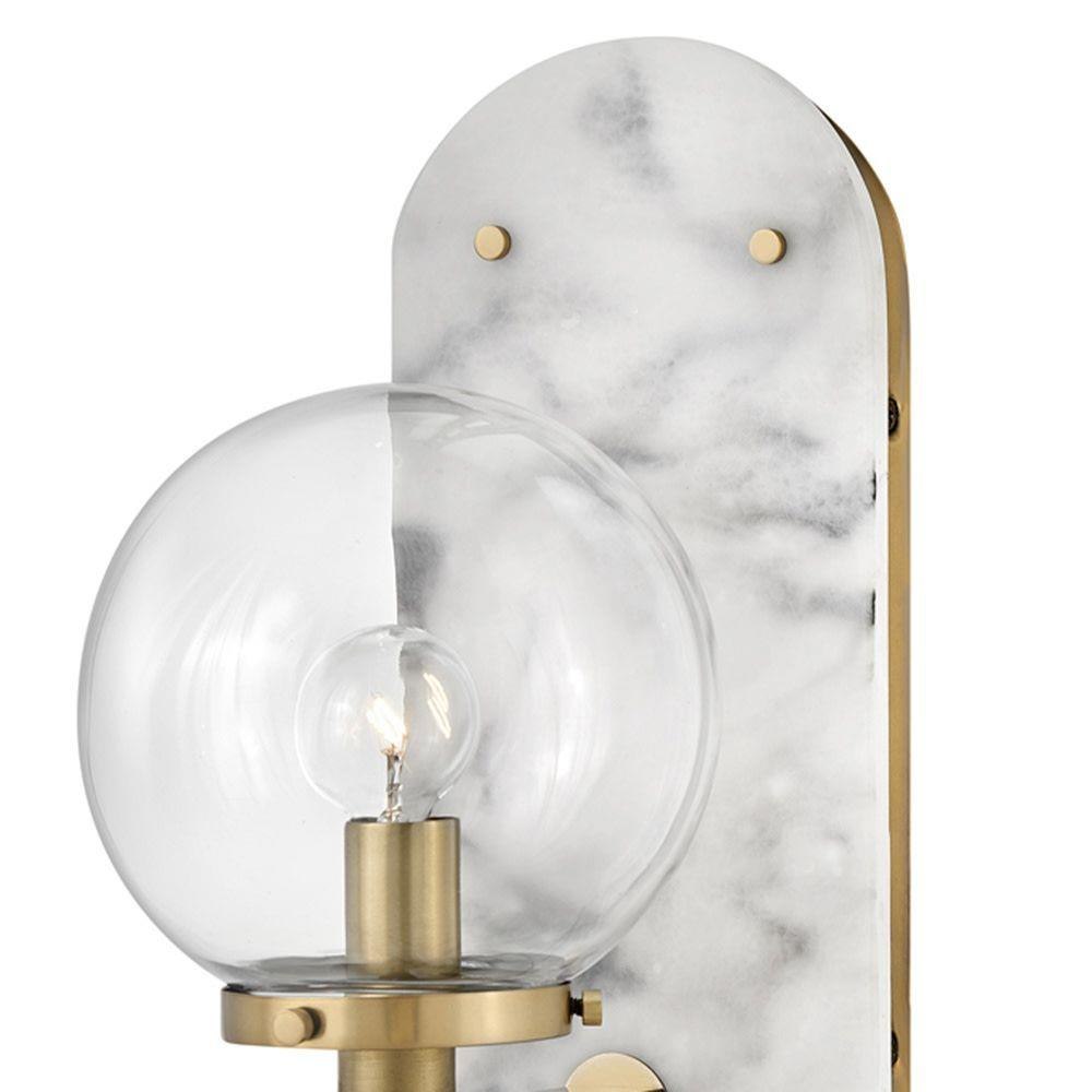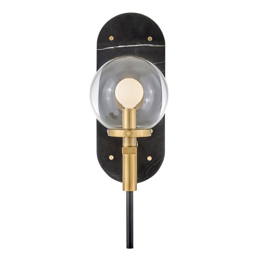 An alluring profile that blends a vintage and modern aesthetic, Gilda is the best of both worlds. This show-stopping sconce showcases a large clear glass globe atop a brass stem with contrasting rivets on a luxurious Black Marble or Faux Alabaster backplate. Gilda features a concealed on/off switch and removable cord and can be hardwired or plugged in.Suitable for use in dry (indoor) locations as defined by NEC and CEC. Meets United States UL Underwriters Laboratories & CSA Canadian Standards Association Product Safety Standards / Classic gleaming light brass finish / Merging the best of traditional and modern elements, with a sophisticated and streamlined silhouette perfect for any space / On/off switch with removable cord on backplate / Mounting hardware is hidden on the backplate to ensure a clean silhouette / Optional cord cover available, 6938HB / Shown with G16.5 bulbs (not included) / The Lisa McDennon Collection offers a striking mix of edgy, sculptural silhouettes that incorporate modern, organic elements and luxe materials, brought to life by her innovative and original point of view.