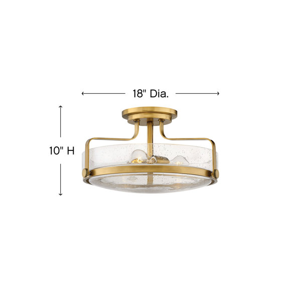 The sophisticated, semi-flush mount ceiling light elevates a traditional fixture with a sleek, Retro style. A unique Clear Seedy Glass bowl rests within a prominent metal ring, suspended from the canopy, with decorative knobs. Illuminated by a trio of 14w Medium LED bulbs (not included), it creates uplighting against the ceiling while casting downlighting throughout the space below. Available in a robust, aged umber Oil Rubbed Bronze finish, adding an earthy depth to spaces.