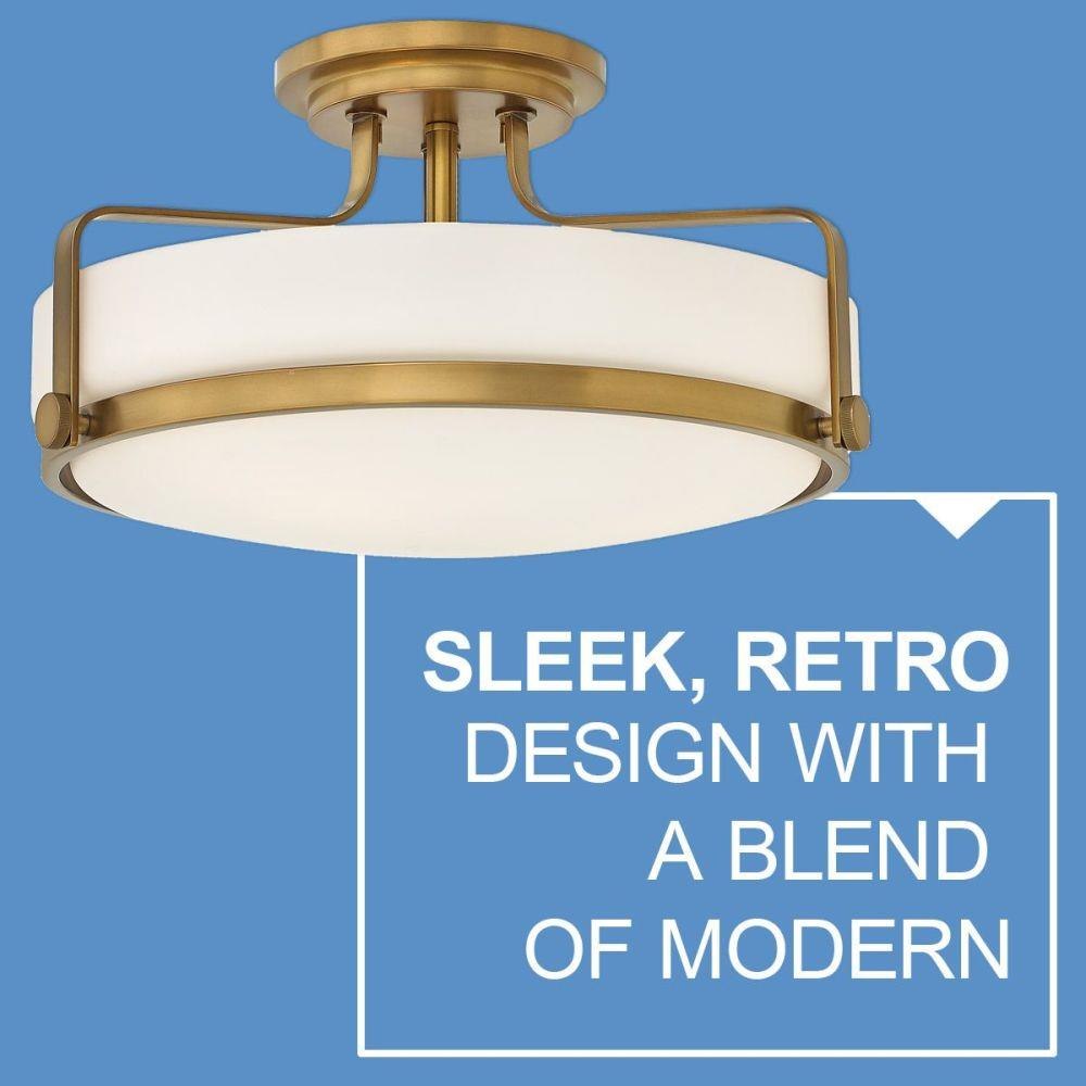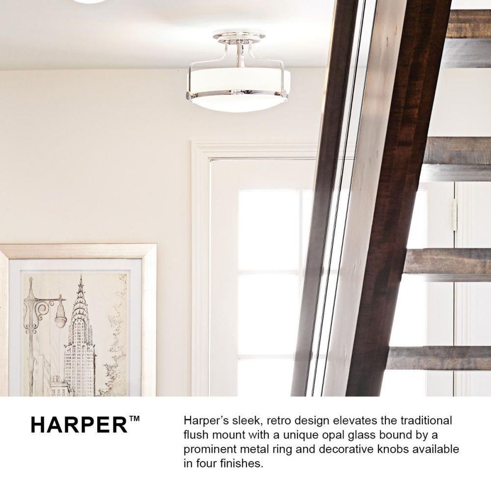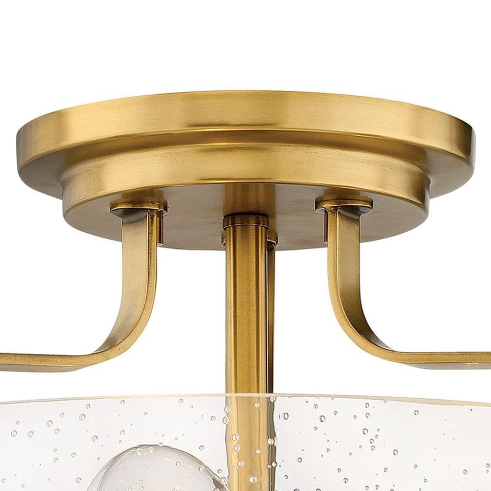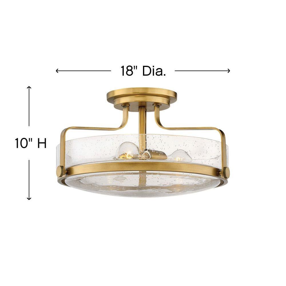 Harper’s sleek, retro design elevates the traditional ceiling mount with a unique clear seedy glass bound by a prominent metal ring and decorative knobs. Available in five classic finishes.Suitable for use in dry (indoor) locations as defined by NEC and CEC. Meets United States UL Underwriters Laboratories & CSA Canadian Standards Association Product Safety Standards / Classic gleaming light brass finish / Merging the best of traditional and modern elements, with a sophisticated and streamlined silhouette perfect for any space