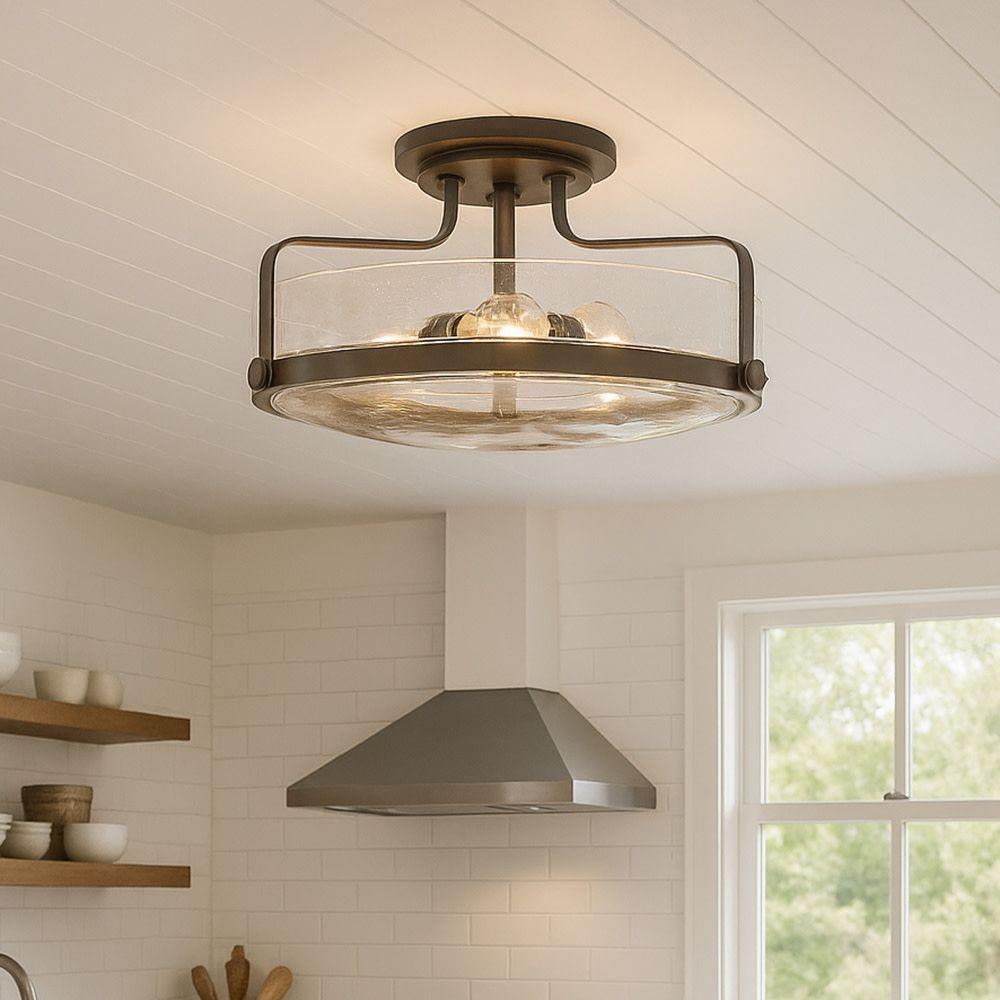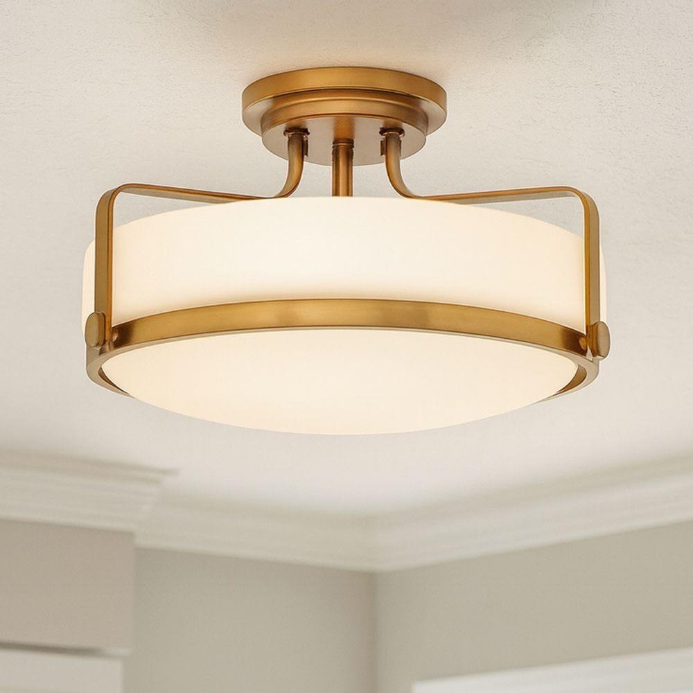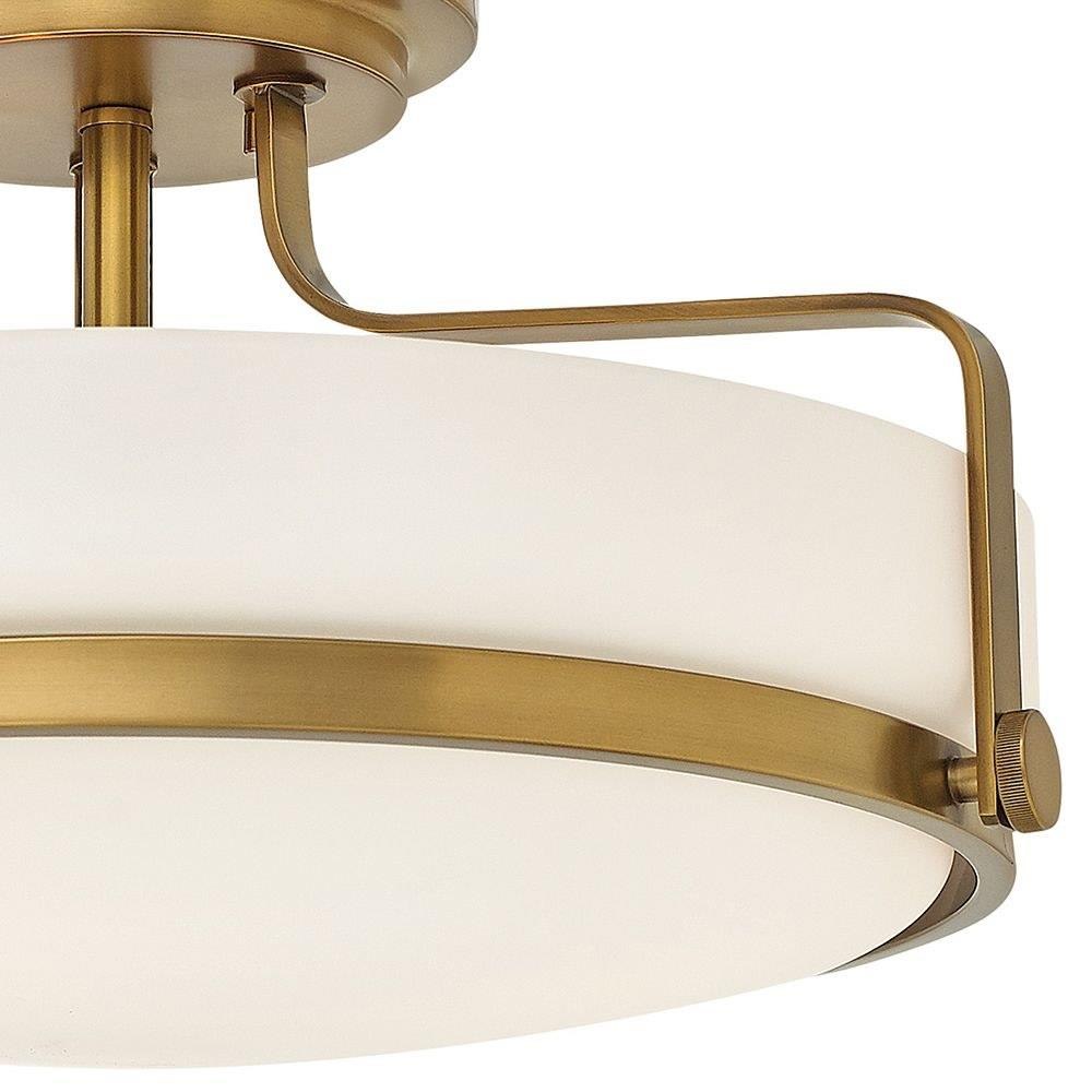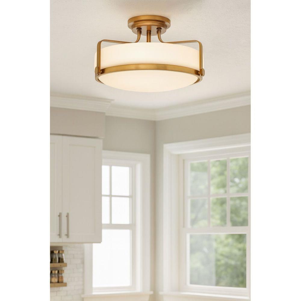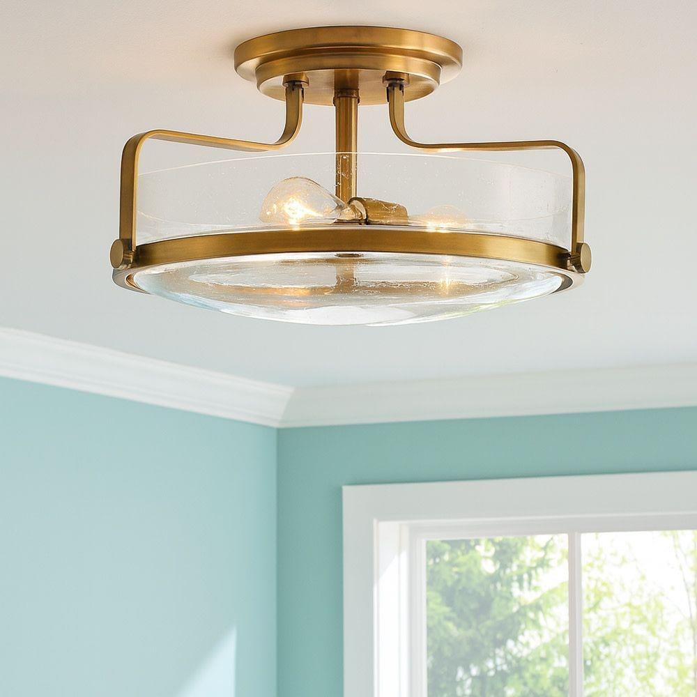 Harper’s sleek, retro design elevates the traditional ceiling mount with a unique clear seedy glass bound by a prominent metal ring and decorative knobs. Available in five classic finishes.Suitable for use in dry (indoor) locations as defined by NEC and CEC. Meets United States UL Underwriters Laboratories & CSA Canadian Standards Association Product Safety Standards / Classic gleaming light brass finish / Merging the best of traditional and modern elements, with a sophisticated and streamlined silhouette perfect for any space