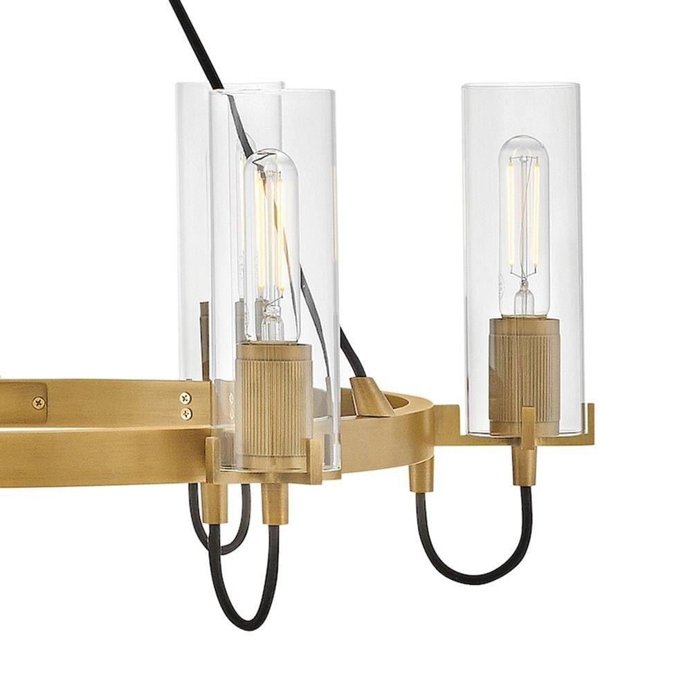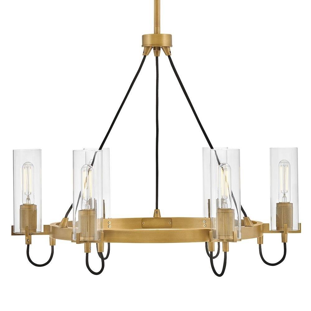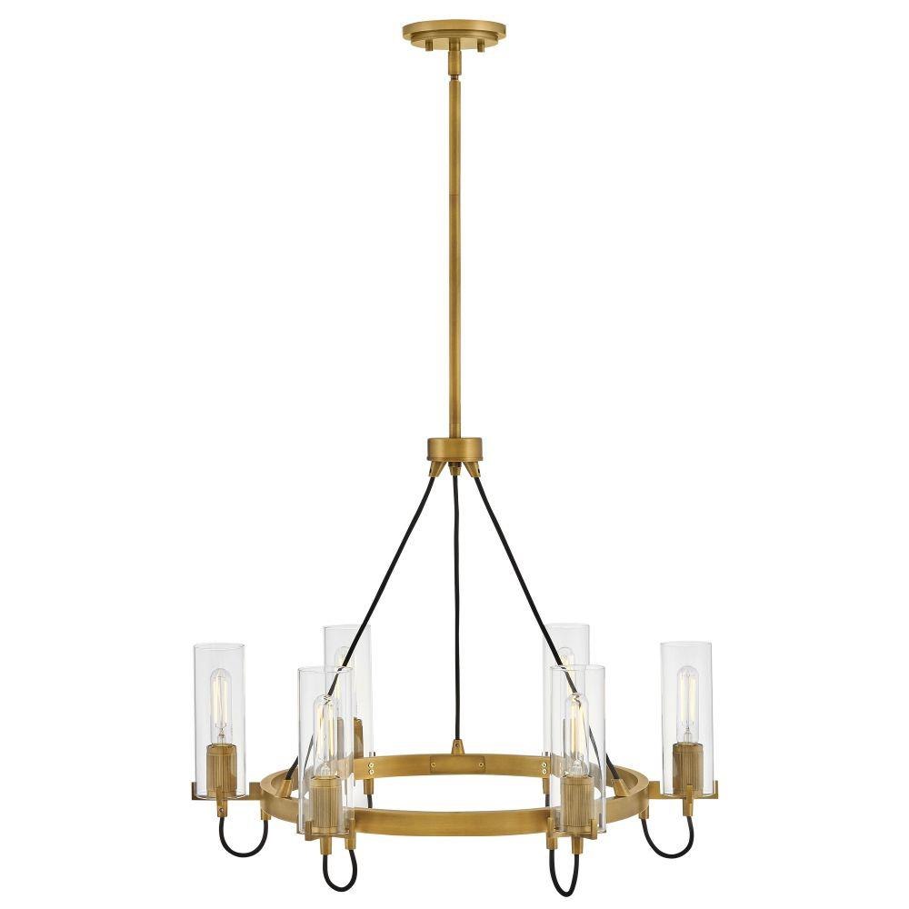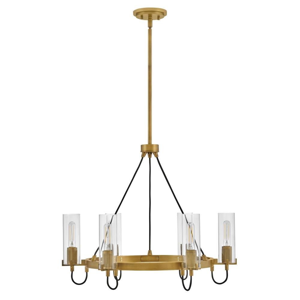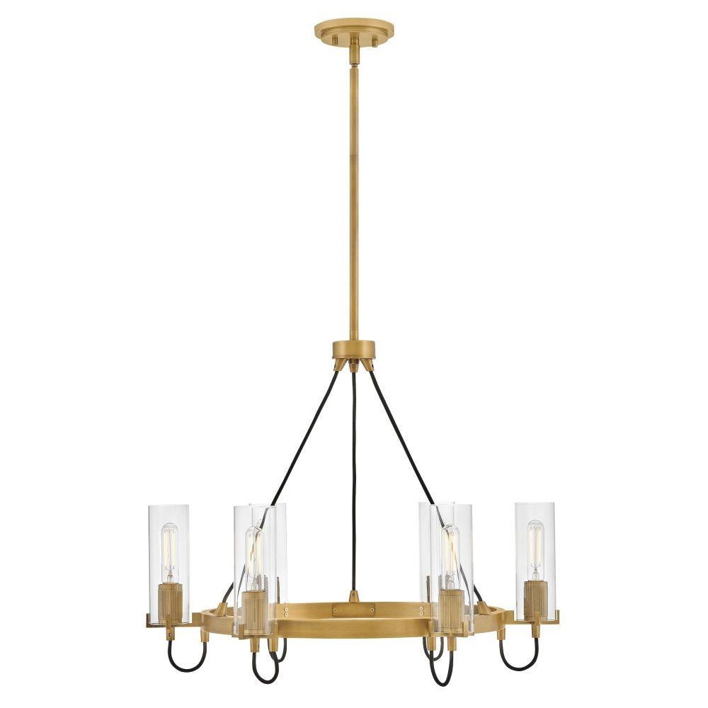 A versatile stunner, Ryden‘s elongated, clear glass shades envelop its bulbs, held by heavy cast prongs and ribbed details. Black, fabric-wrapped cords perfectly complement Heritage Brass, Black, and Brushed Nickel finishes.