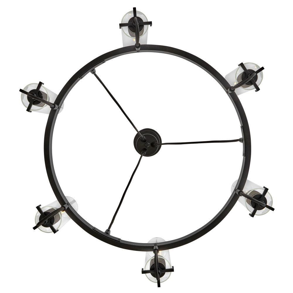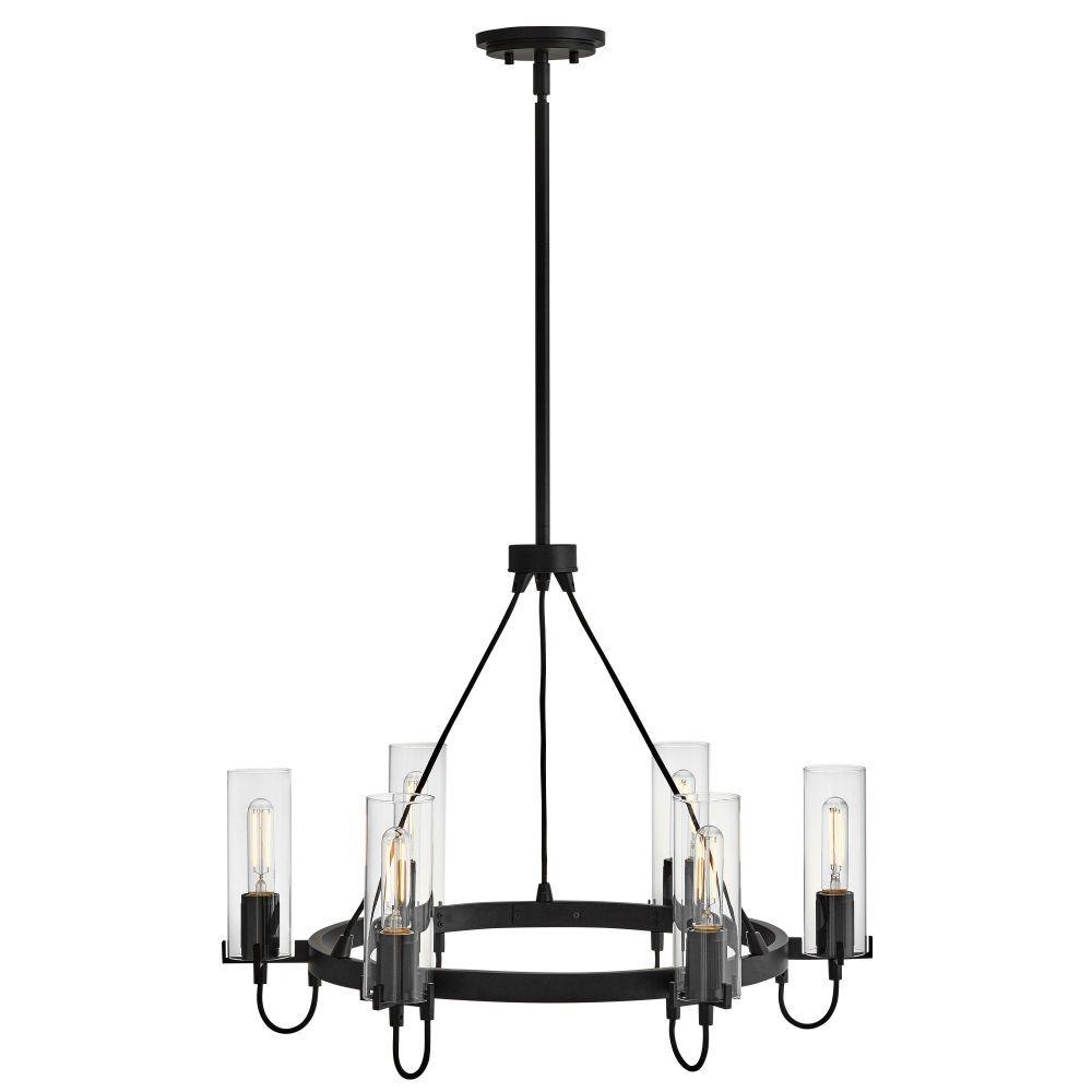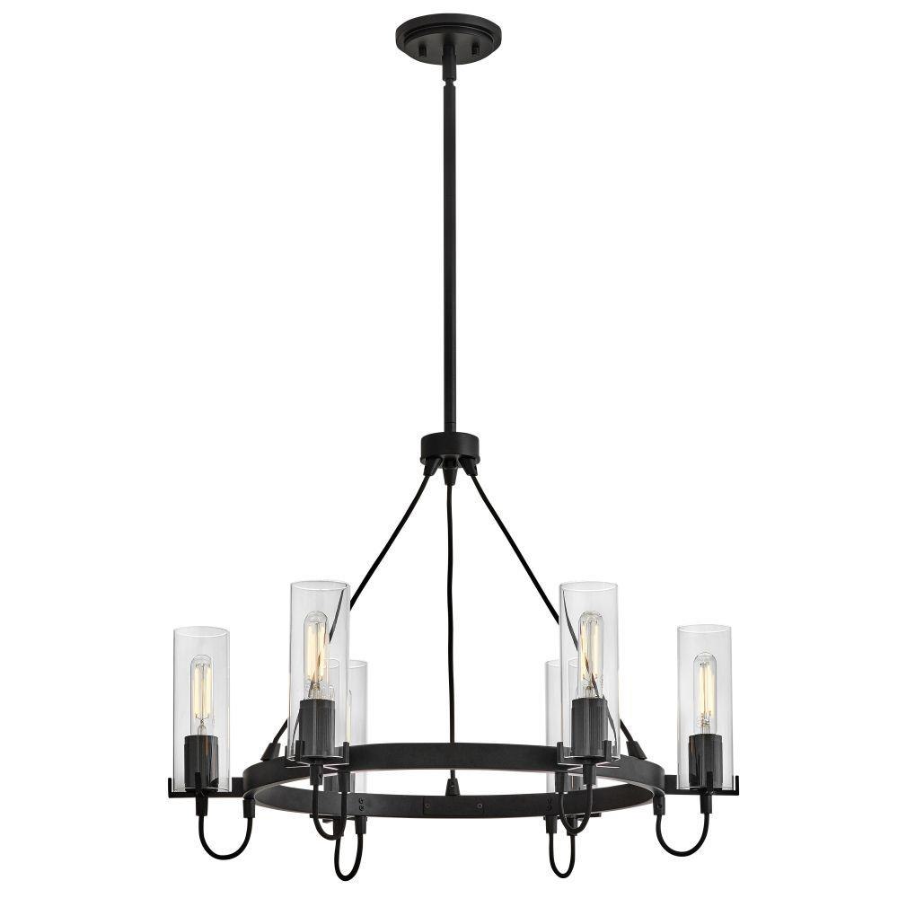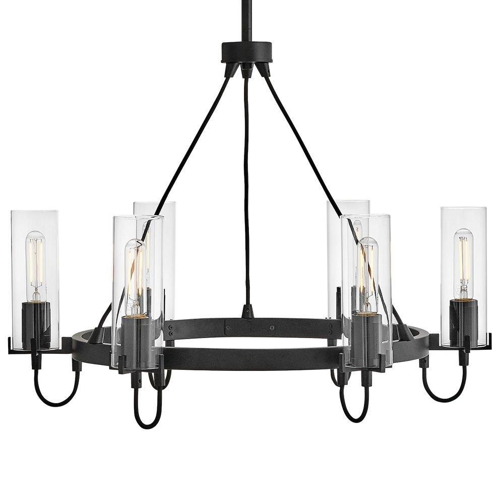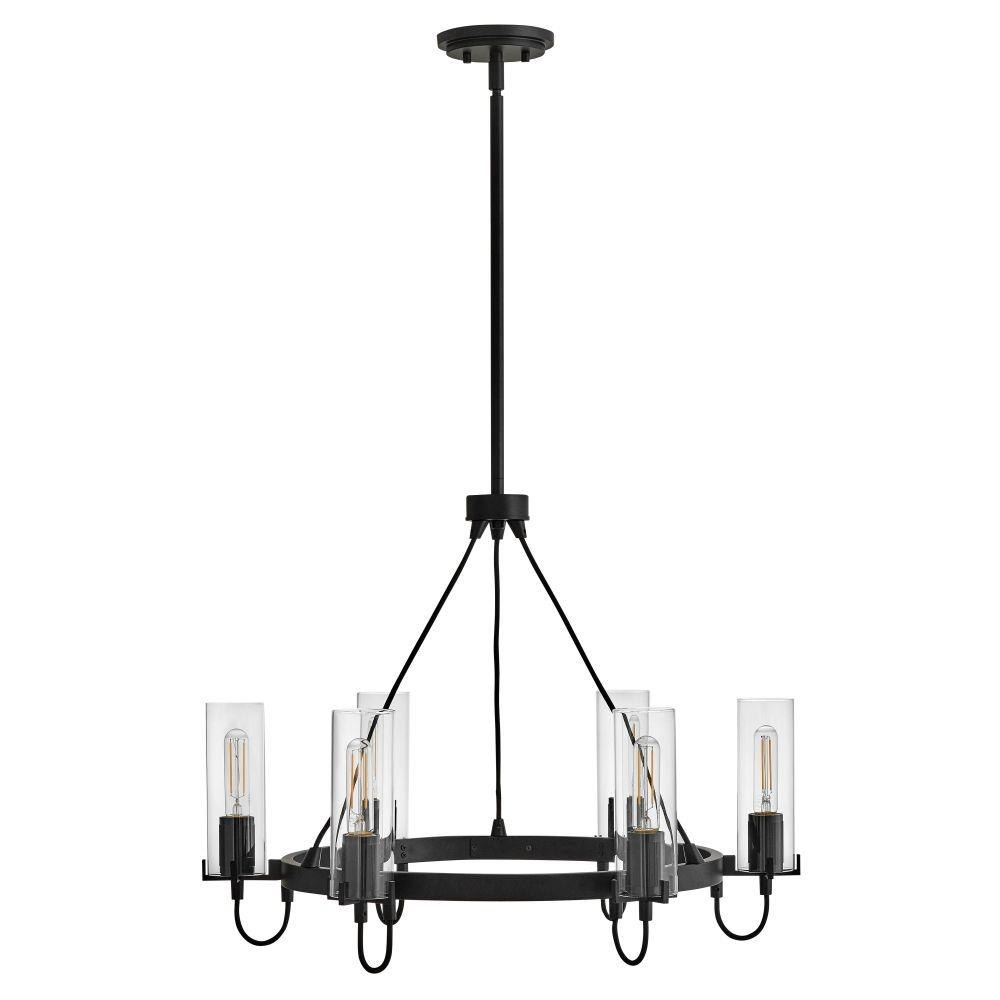 A versatile stunner, Ryden‘s elongated, clear glass shades envelop its bulbs, held by heavy cast prongs and ribbed details. Black, fabric-wrapped cords perfectly complement Heritage Brass, Black, and Brushed Nickel finishes.