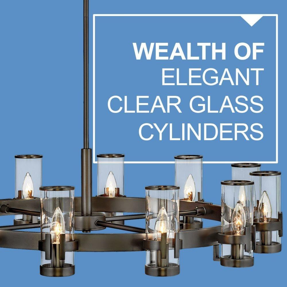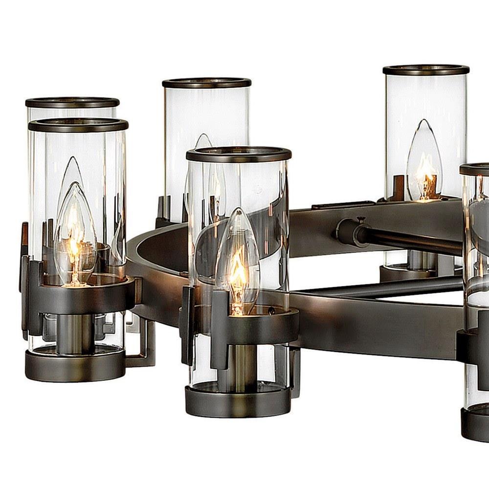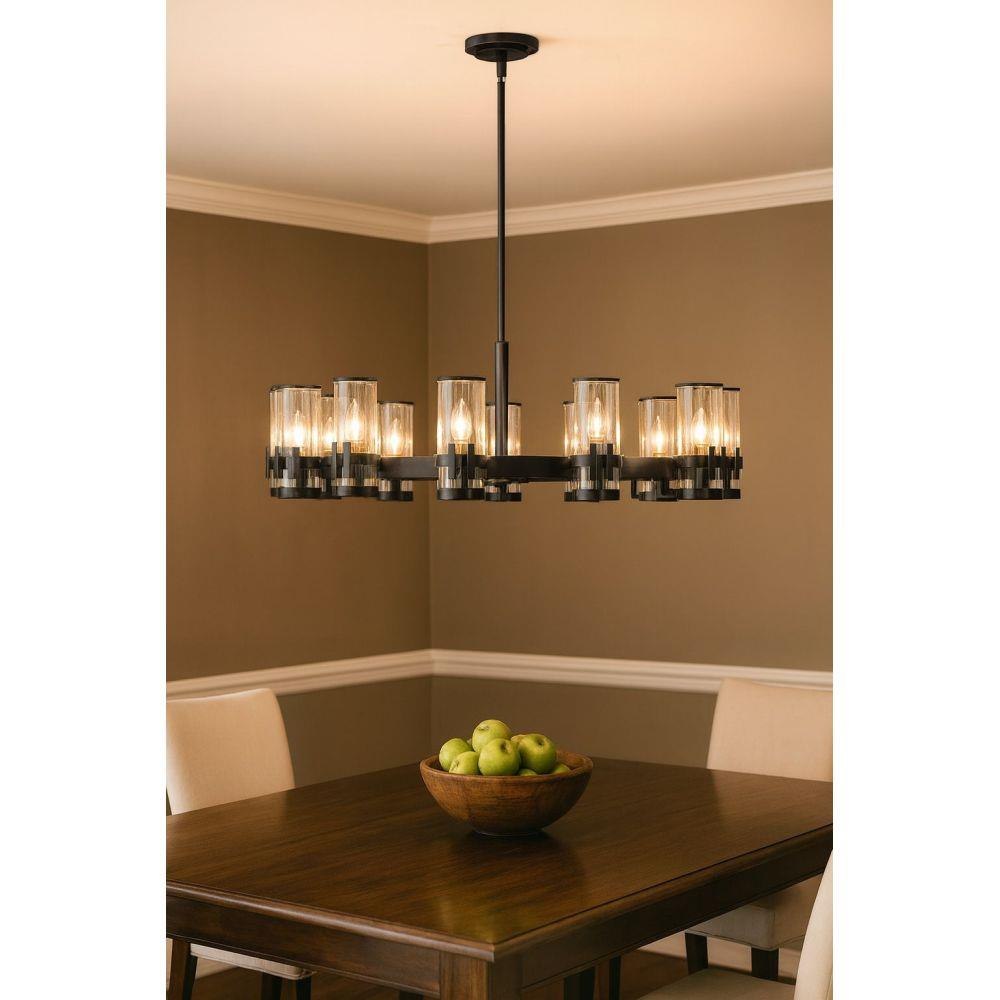 The Reeve chandelier balances sophistication with simplicity. The traditional low-profile silhouette is elevated by a wealth of elegant clear glass cylinders. Each glass is secured with a cast double-T bracelet matching the frame's luxurious finish with a corresponding metal band at the top.Suitable for use in dry (indoor) locations as defined by NEC and CEC. Meets United States UL Underwriters Laboratories & CSA Canadian Standards Association Product Safety Standards / This fixture includes multiple down stems in various lengths to customize the installation height of the fixture, including one 6" stem and two 12" stems. / This stem hung fixture may be hung on a sloped ceiling / Striking black finish enhances design / Classic, elegant lines and timeless details enhance a traditional space