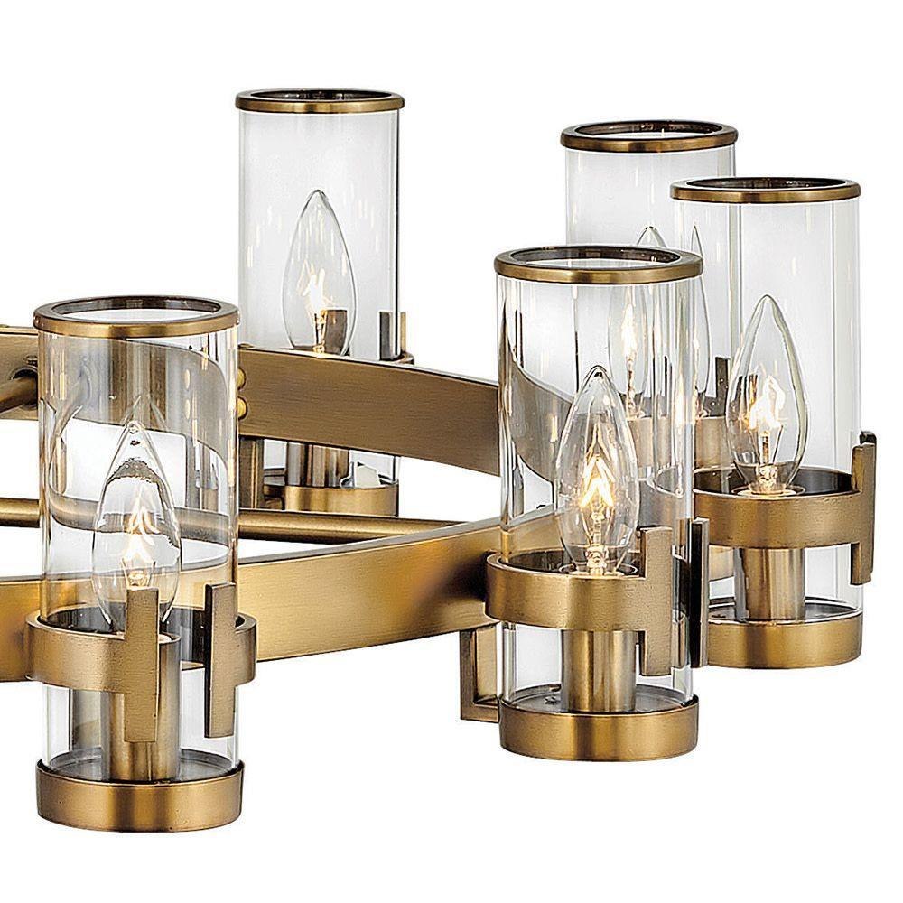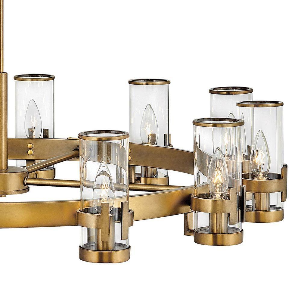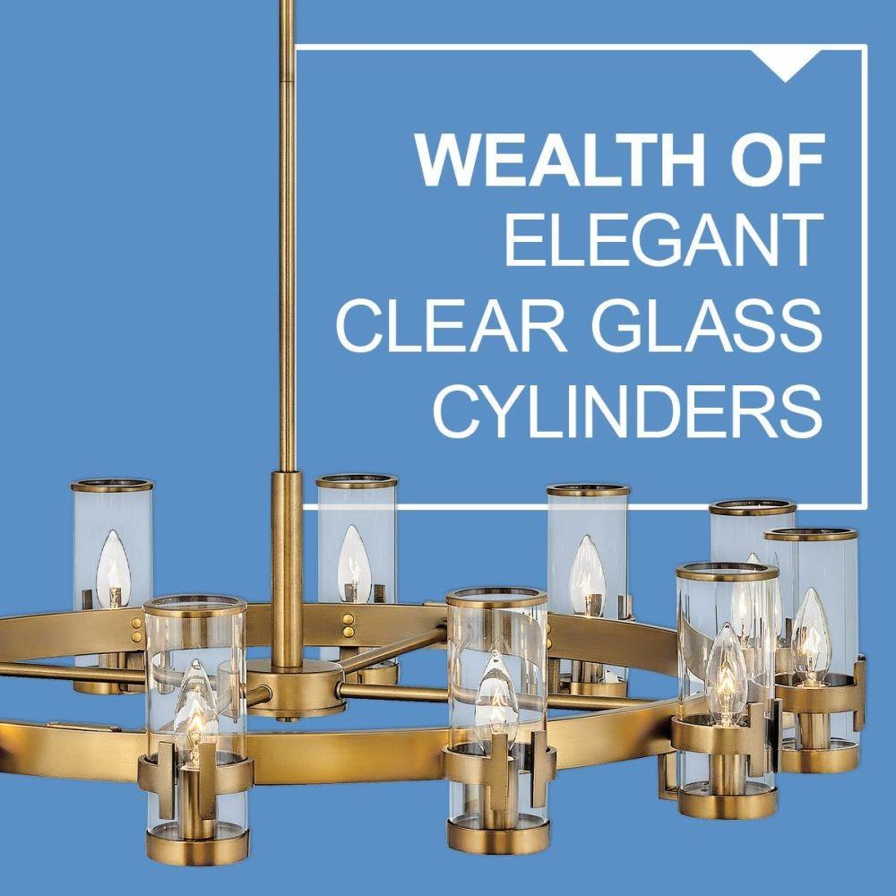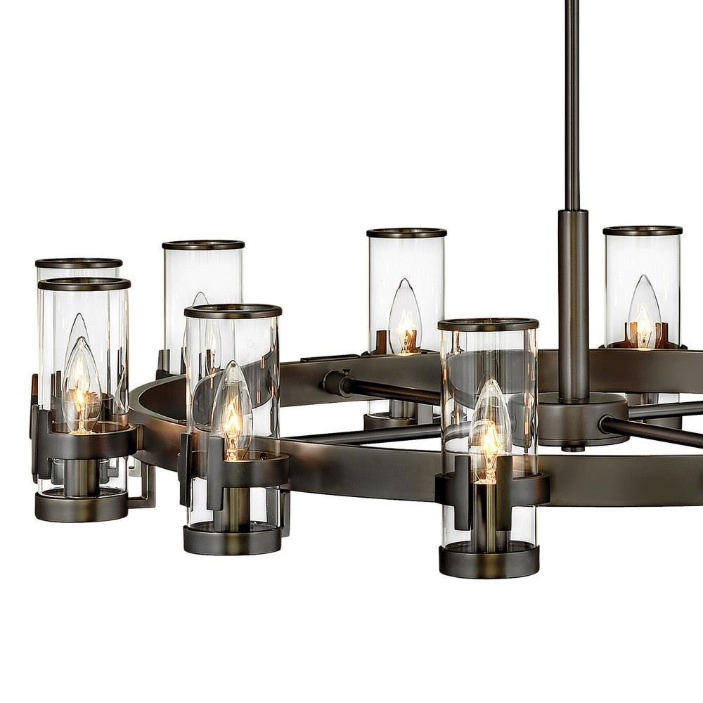 The Reeve chandelier balances sophistication with simplicity. The traditional low-profile silhouette is elevated by a wealth of elegant clear glass cylinders. Each glass is secured with a cast double-T bracelet matching the frame's luxurious finish with a corresponding metal band at the top.Suitable for use in dry (indoor) locations as defined by NEC and CEC. Meets United States UL Underwriters Laboratories & CSA Canadian Standards Association Product Safety Standards / This fixture includes multiple down stems in various lengths to customize the installation height of the fixture, including one 6" stem and two 12" stems. / This stem hung fixture may be hung on a sloped ceiling / Striking black finish enhances design / Classic, elegant lines and timeless details enhance a traditional space