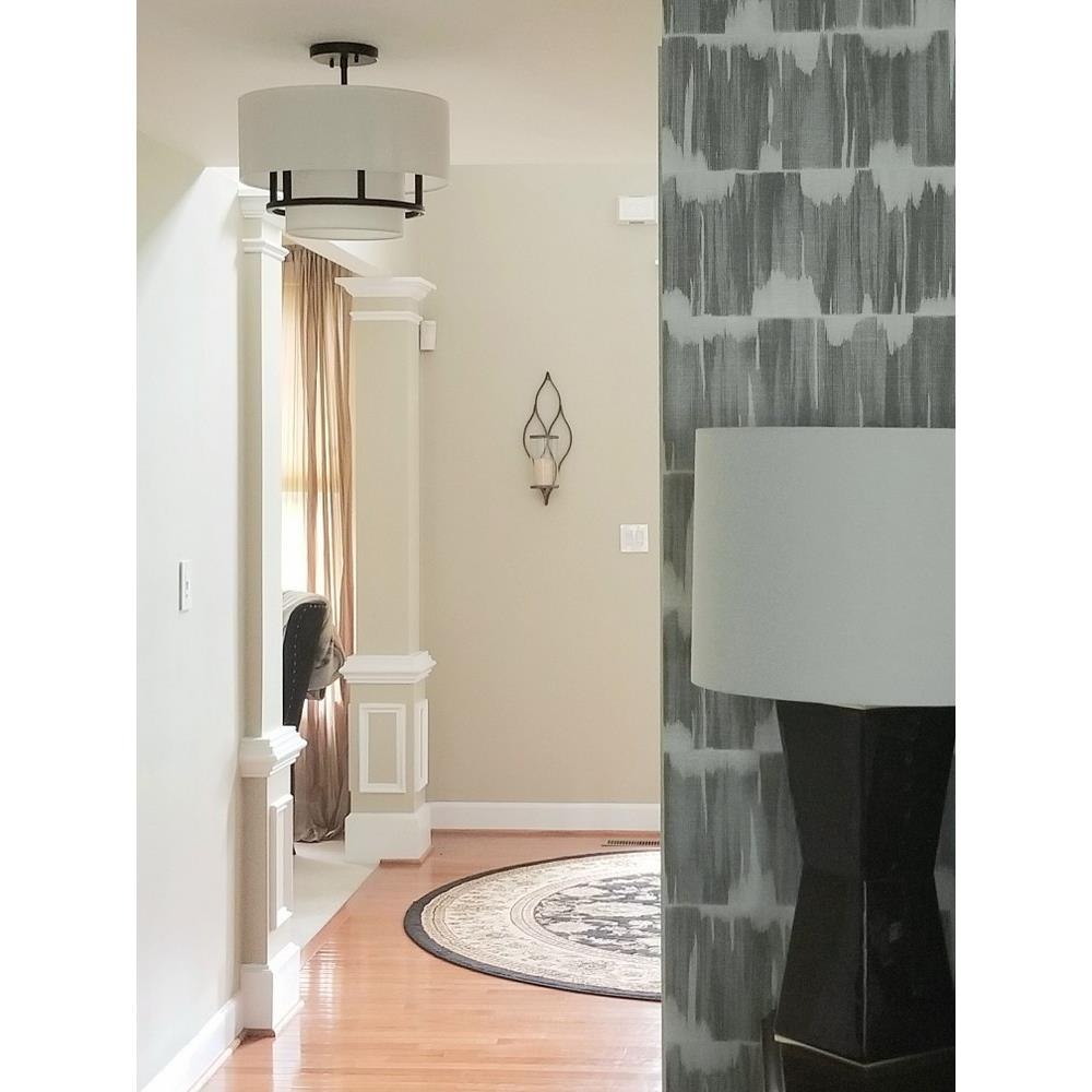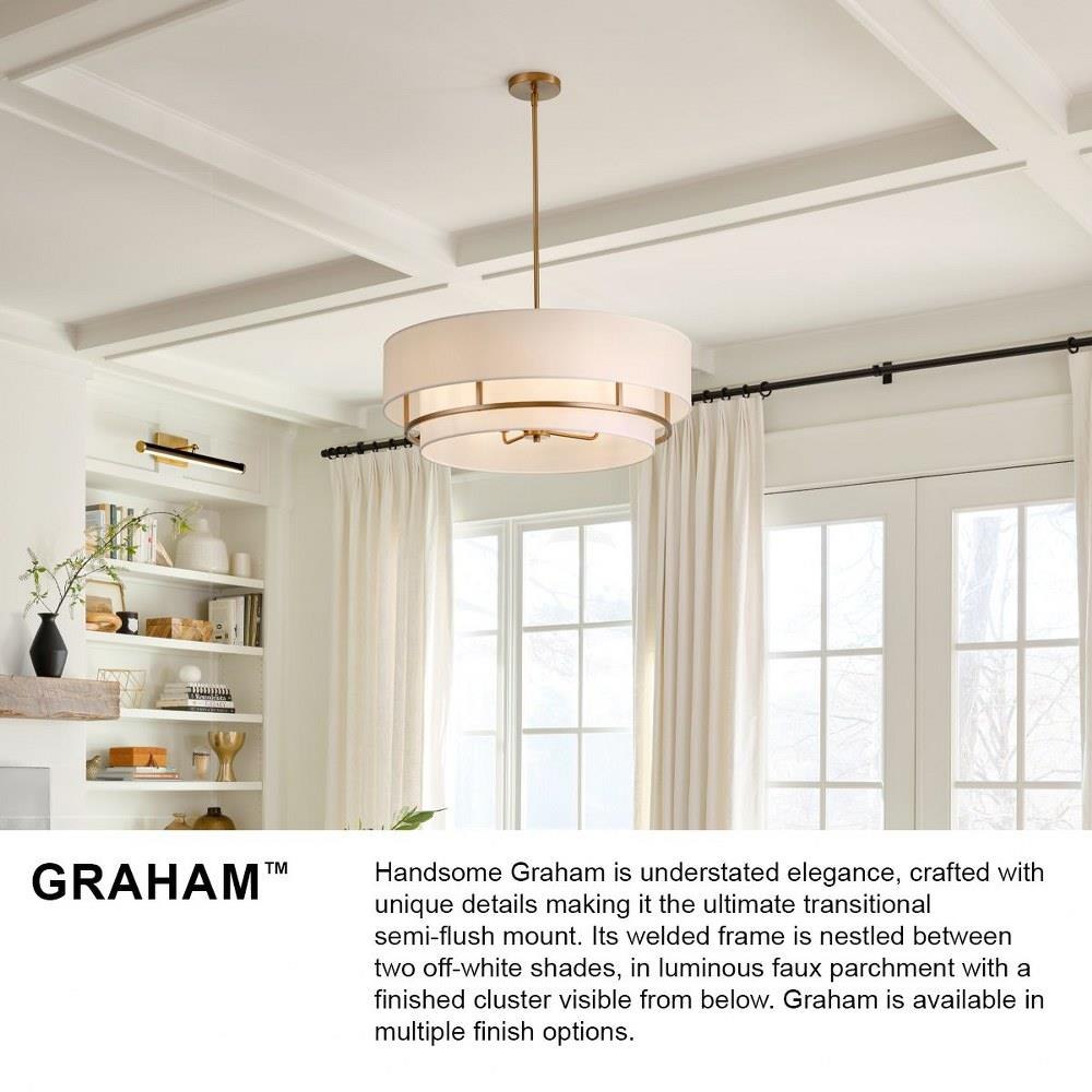 Handsome Graham is understated elegance, crafted with unique details making it the ultimate transitional semi-flush mount. Its welded frame is nestled between two off-white shades, in luminous faux parchment with a finished cluster visible from below. Graham is available in multiple finish options.