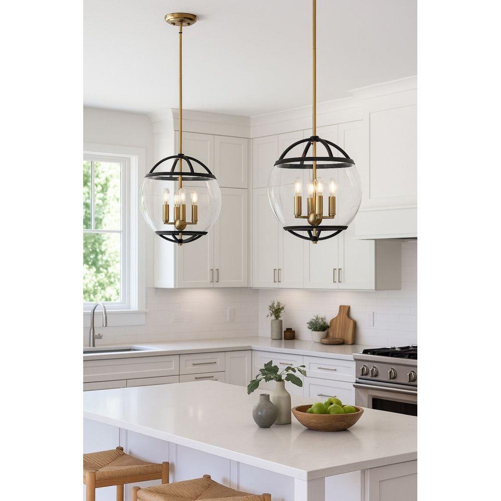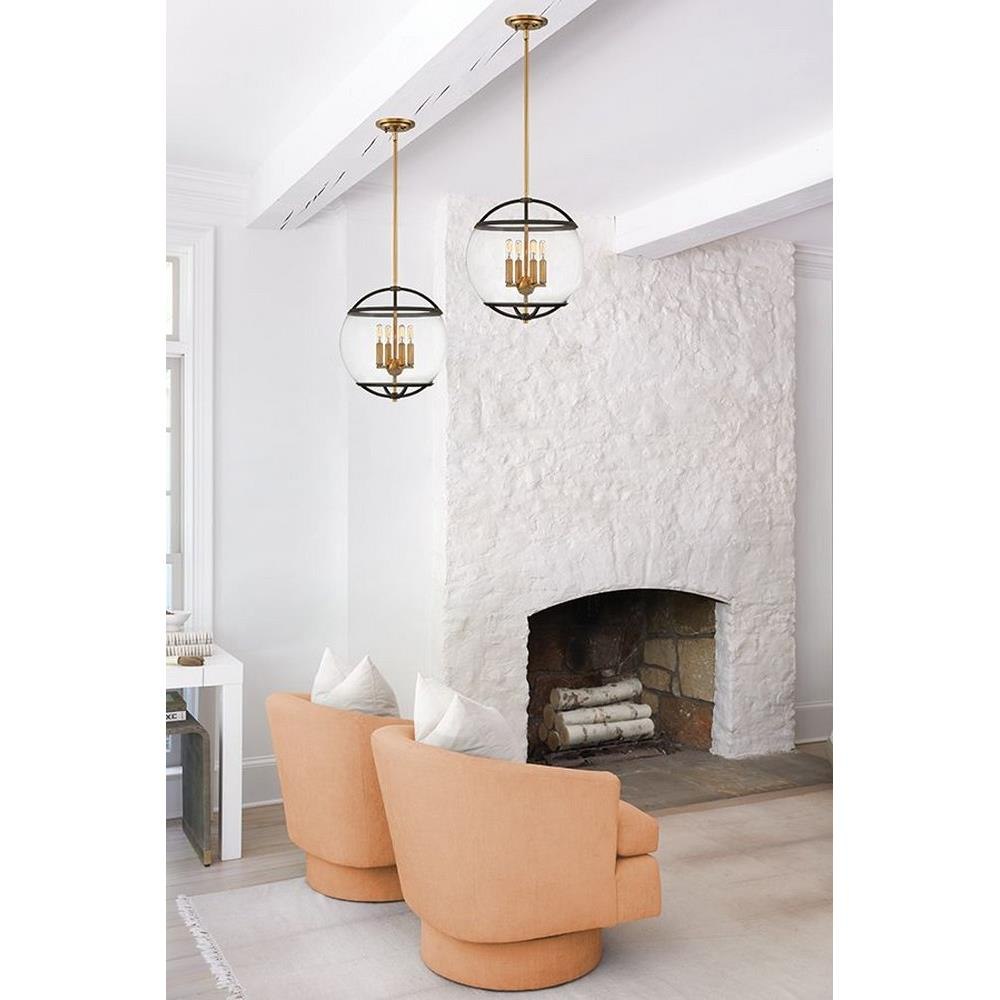 The wide glass band featured in Calvin clearly has global appeal, but the sphere of influence does not stop there. The orb is completed by the rounded, open cage on top and bottom to add style and stability. This mid-century modern silhouette in Heritage Brass or Black with Heritage Brass finish encloses a classic candle cluster.