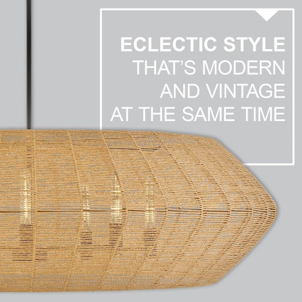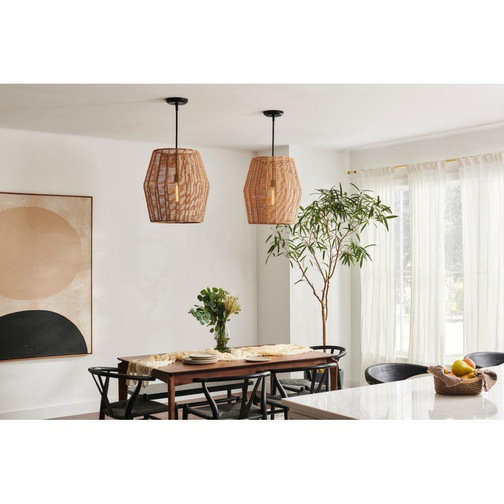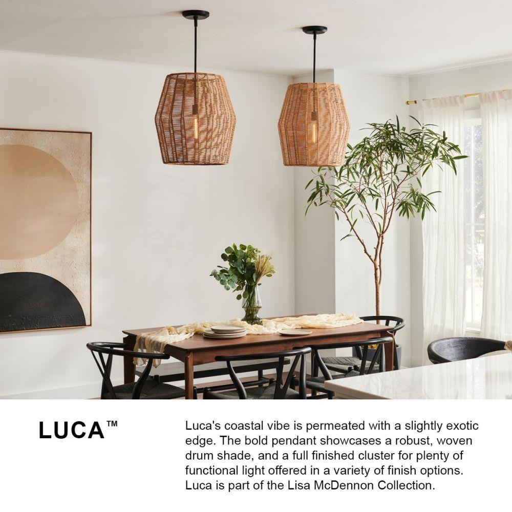 Luca's coastal vibe is permeated with a slightly exotic edge. The bold pendant showcases a robust, woven drum shade, and a full finished cluster for plenty of functional light offered in a variety of finish options. Luca is part of the Lisa McDennon Collection.