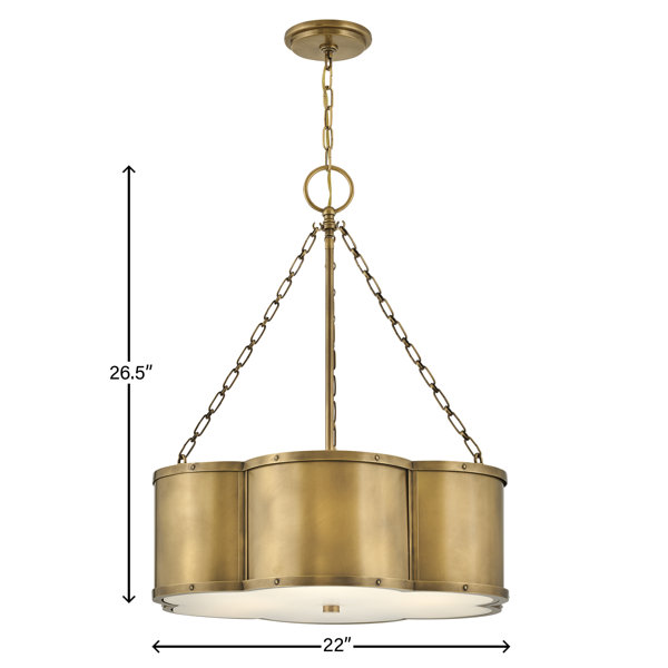 Overall: 22-in dia. x 26.5-in H | Canopy: 5.5-in dia. | Weight: 13 lbs. | Chain: 60-in | Light Source: (3) 12w Medium LED bulbs (not included) | Voltage: 120v | Glass: Etched Lens