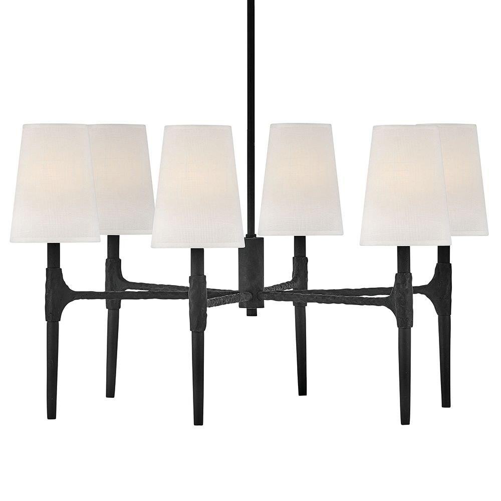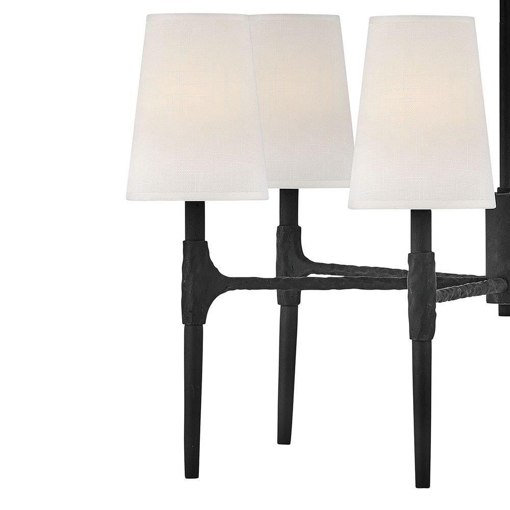 Sleek candle arms topped by softly tapered fabric shades perfectly complement Beaumont's sturdy hand-hammered details. Rustic yet traditional, the stylish transitional silhouette works well in any setting, from classically elegant to chic and modern.Suitable for use in dry (indoor) locations as defined by NEC and CEC. Meets United States UL Underwriters Laboratories & CSA Canadian Standards Association Product Safety Standards / This fixture includes multiple down stems in various lengths to customize the installation height of the fixture, including one 6" stem and two 12" stems. / This stem hung fixture may be hung on a sloped ceiling / Striking black finish enhances design / Shades are removeable / Artisanal details, a rich finish and artisanal elements add warm rustic style