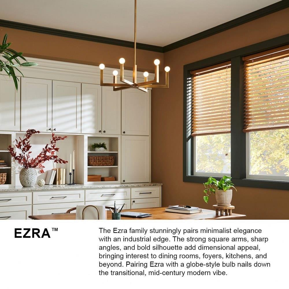 The Ezra family stunningly pairs minimalist elegance with an industrial edge. The strong square arms, sharp angles, and bold silhouette add dimensional appeal, bringing interest to dining rooms, foyers, kitchens, and beyond. Pairing Ezra with a globe-style bulb nails down the transitional, mid-century modern vibe.