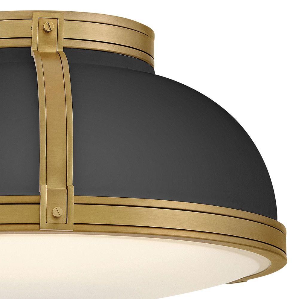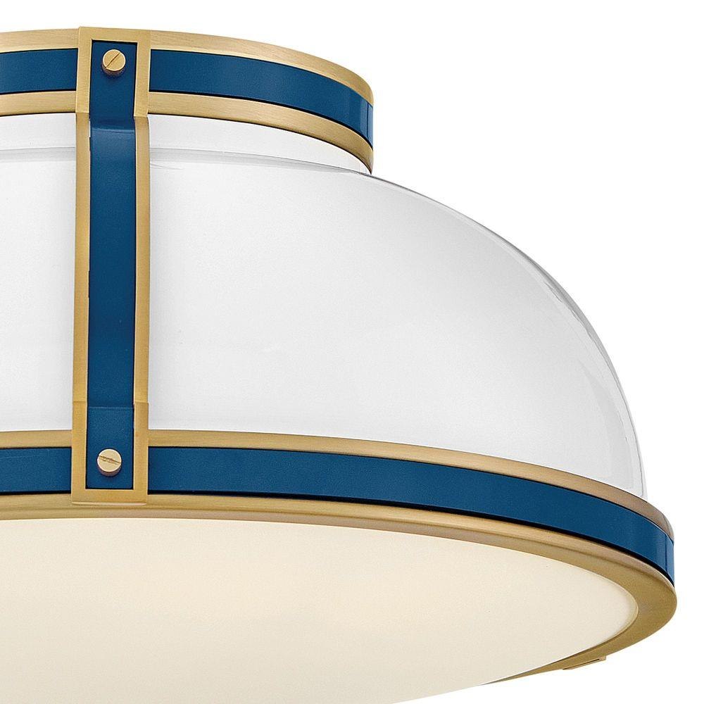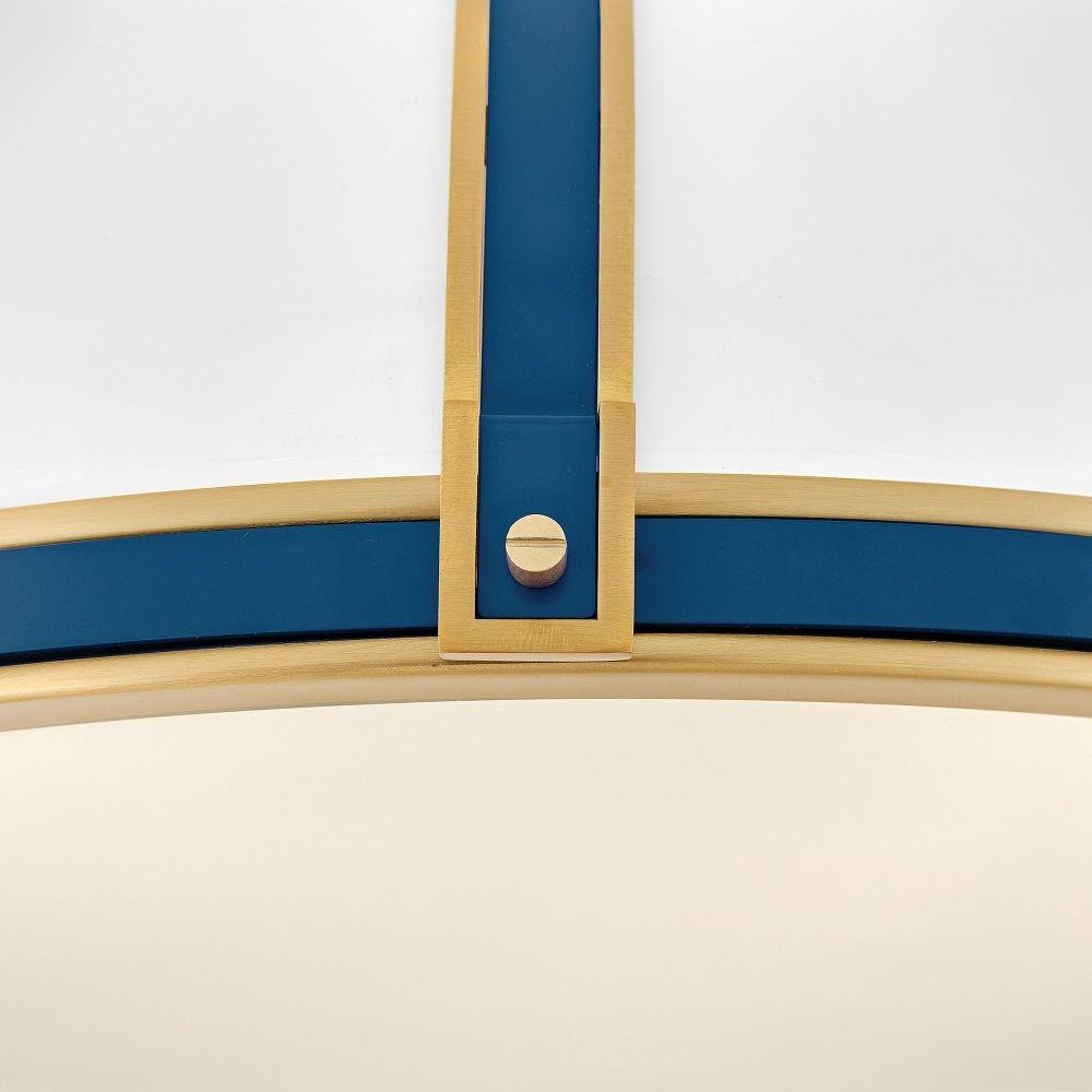 Timeless with a classic equestrian aesthetic, Barton’s metal dome shade with double-strap design is available in Black, Matte White, or Gloss White with Vivid Navy finishes complemented by Lacquered Brass and an Etched Opal glass diffuser.