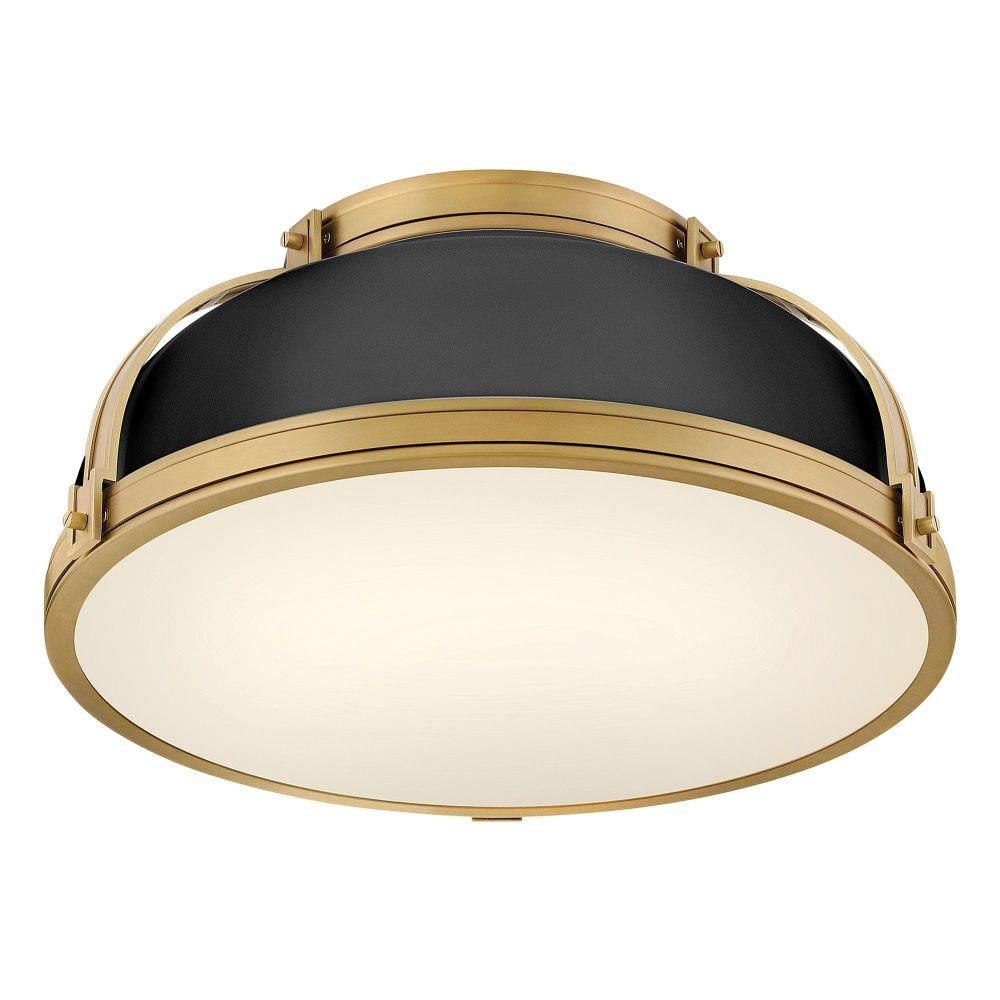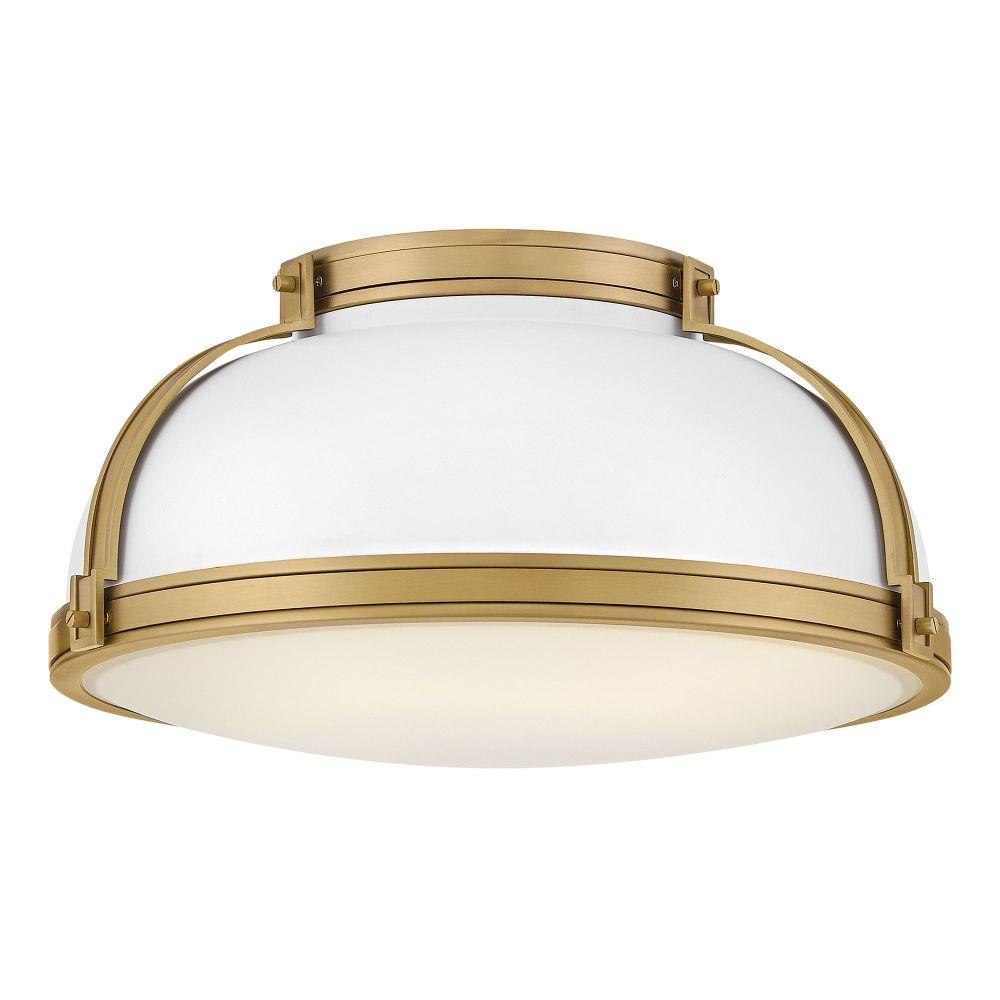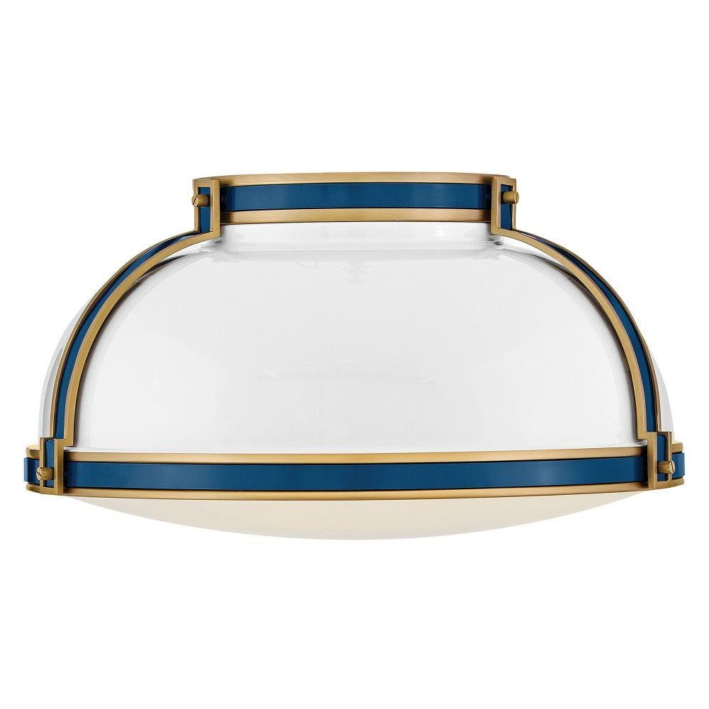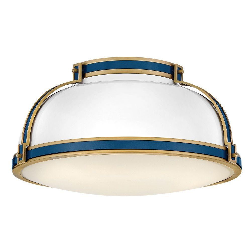 Timeless with a classic equestrian aesthetic, Barton’s metal dome shade with double-strap design is available in Black, Matte White, or Gloss White with Vivid Navy finishes complemented by Lacquered Brass and an Etched Opal glass diffuser.