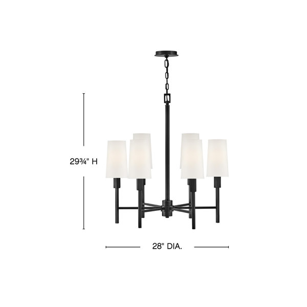 This 6-Light Medium Chandelier is a chic, tailored fixture that stretches light upward through softly tapered paper shades. This Transitional light fixture can be custom hung from a sloped ceiling using the included chain. Illuminated by (6) 5w candelabra LED bulbs (not included), this chandelier looks great with vintage filament bulbs.