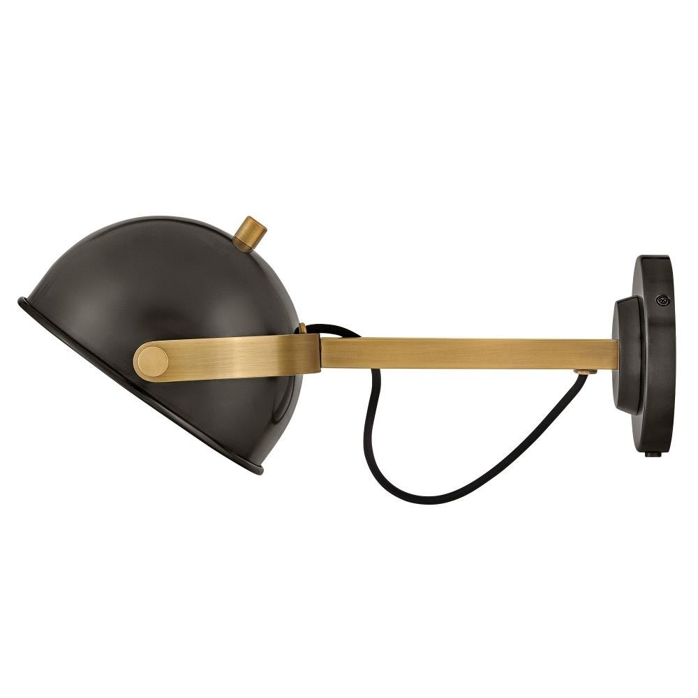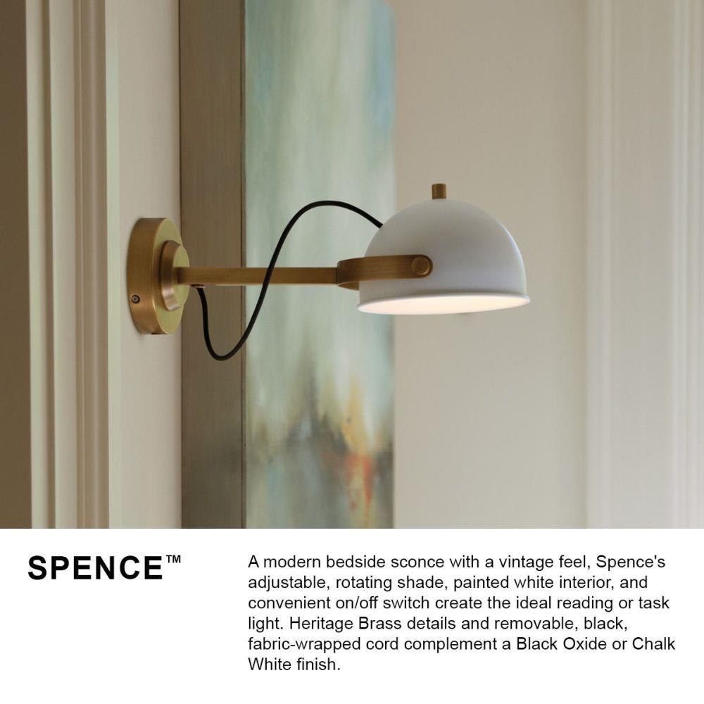 A modern bedside sconce with a vintage feel, Spence’s adjustable, rotating shade, painted white interior, and convenient on/off switch create the ideal reading or task light. Heritage Brass details and removable, black, fabric-wrapped cord complement a Black Oxide or Chalk White finish.