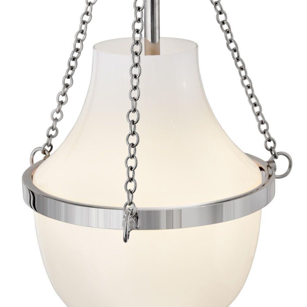 Fusing a sculpted, modern form with classically styled details, Collins features a transitional teardrop shade crafted from blown, Cased Opal glass. A central metal band and delicate chain uprights are available in Black Oxide, Heritage Brass, Heritage Bronze, or Polished Nickel finishes.