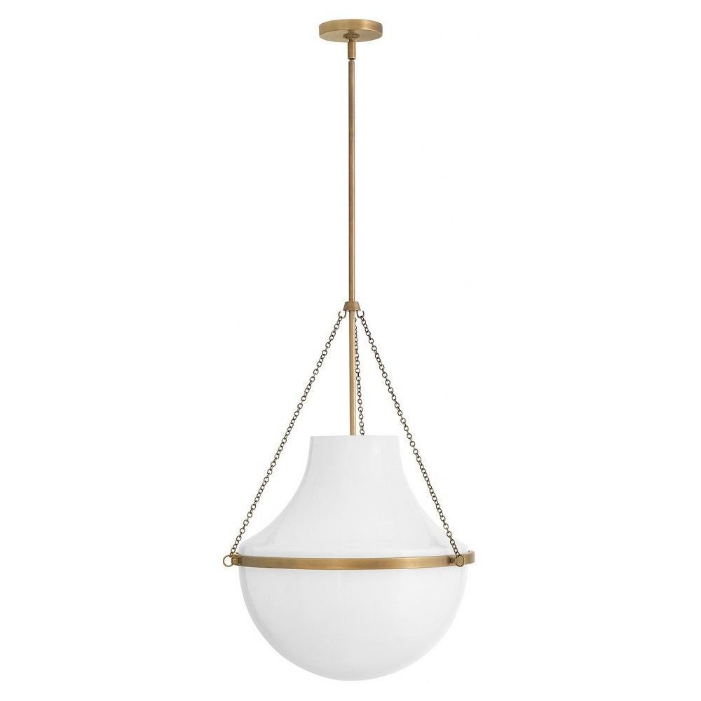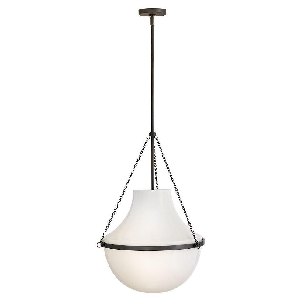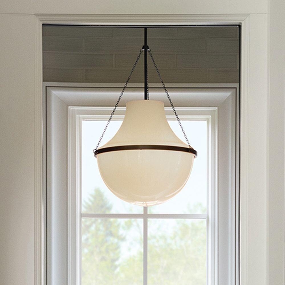 Fusing a sculpted, modern form with classically styled details, Collins features a transitional teardrop shade crafted from blown, cased opal glass. A central metal band and delicate chain uprights are available in Heritage Brass or Black Oxide finishes.