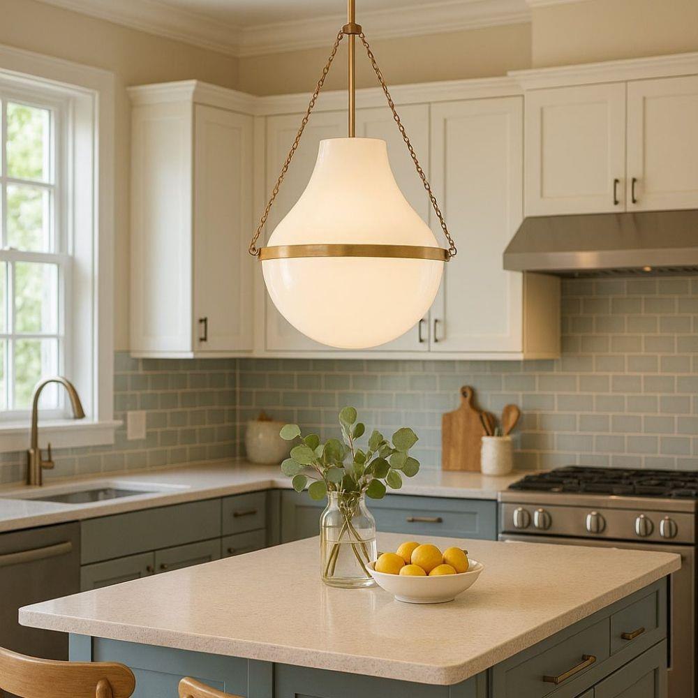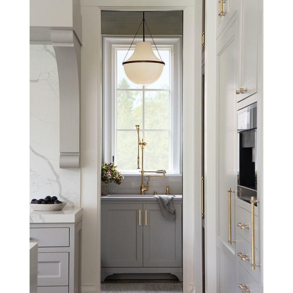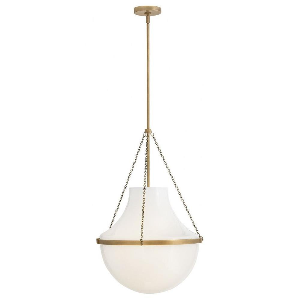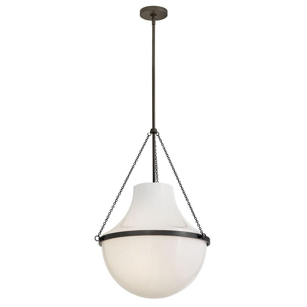 Fusing a sculpted, modern form with classically styled details, Collins features a transitional teardrop shade crafted from blown, cased opal glass. A central metal band and delicate chain uprights are available in Heritage Brass or Black Oxide finishes.