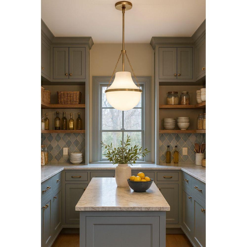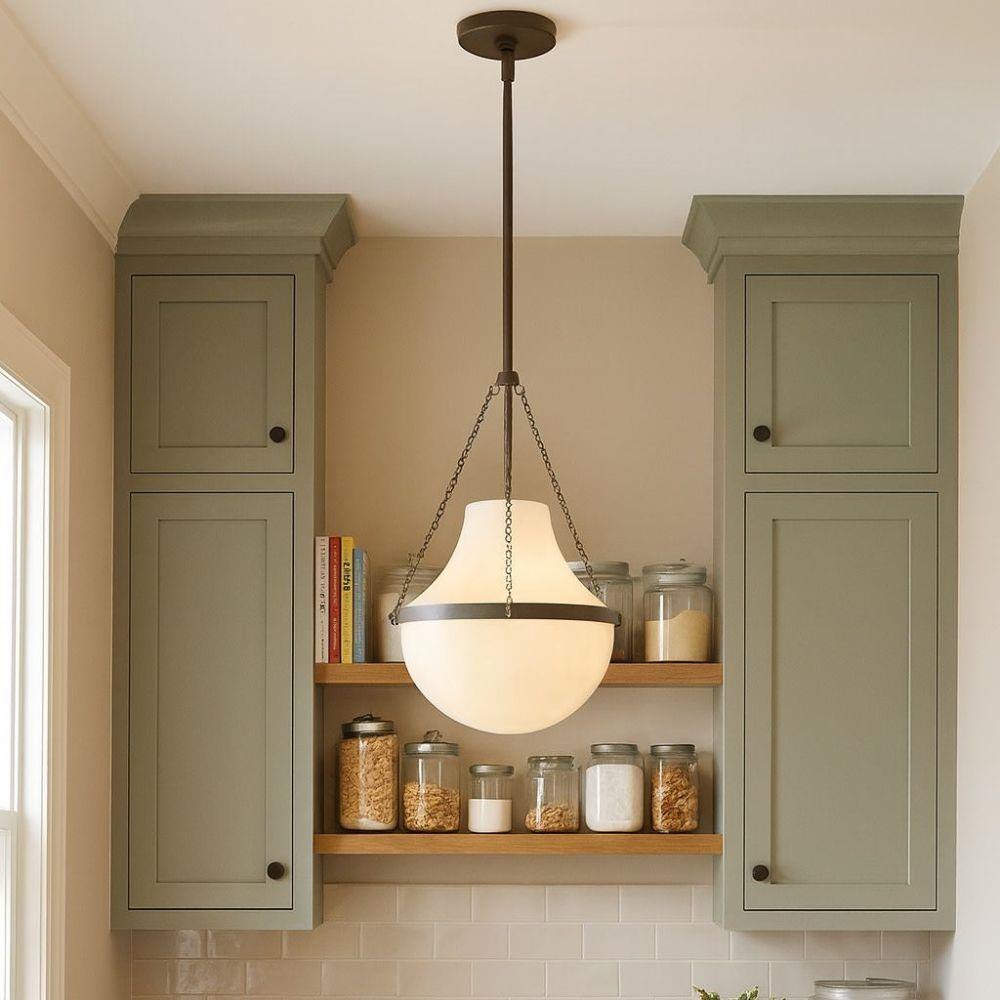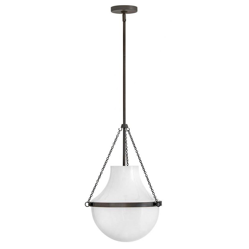 Fusing a sculpted, modern form with classically styled details, Collins features a transitional teardrop shade crafted from blown, cased opal glass. A central metal band and delicate chain uprights are available in Heritage Brass or Black Oxide finishes.
