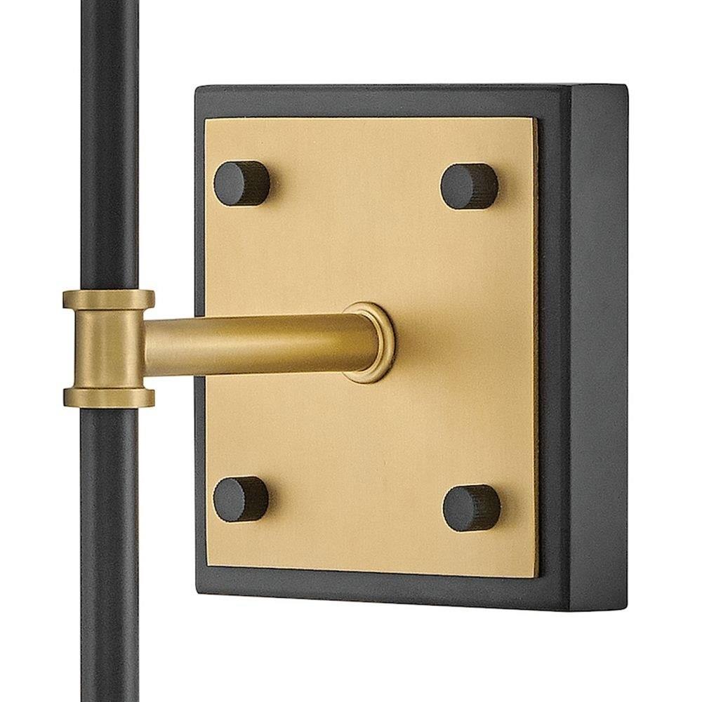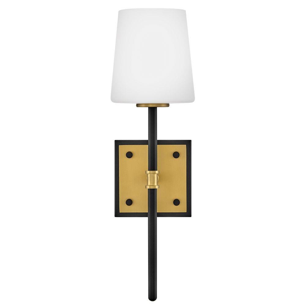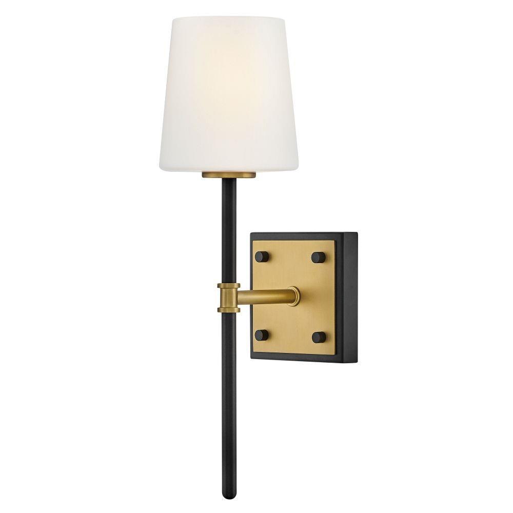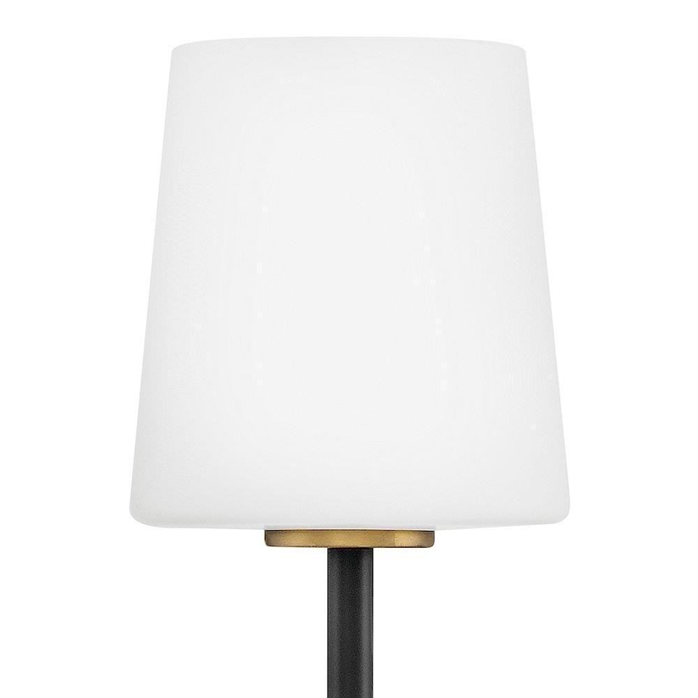 Saunders boasts a striking yet effortless appeal, blending traditional elements with captivating, mid-century modern details. A spoked silhouette and decorative stem holders are finished in Black and Lacquered Brass, paired with blown, etched opal glass shades.