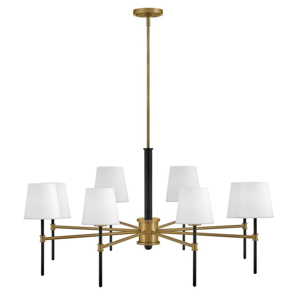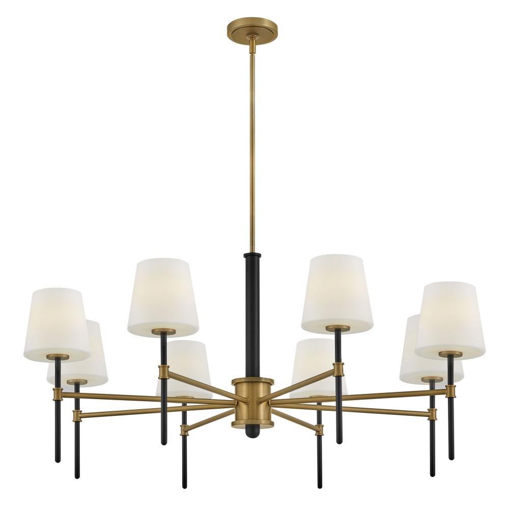 Saunders boasts a striking yet effortless appeal, blending traditional elements with captivating, mid-century modern details. A spoked silhouette and decorative stem holders are finished in Black and Lacquered Brass, paired with blown, etched opal glass shades.