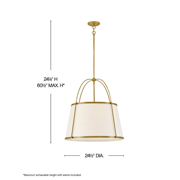 This Drum Chandelier light features a popular two-tone palette that creates a decorative depth with this captivating, contrasting look. Available in several different metallic/non-metallic combinations including ligatures on the outside of the shade. Includes (1) 6" and (2) 12" down stems for an adjustable height of up to 51.5" and can be hung on even or sloped ceilings - perfect in foyers, dining rooms, and lobbies.