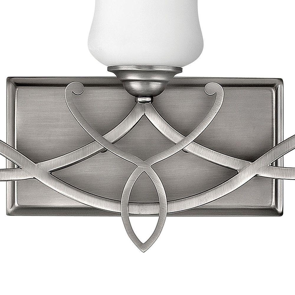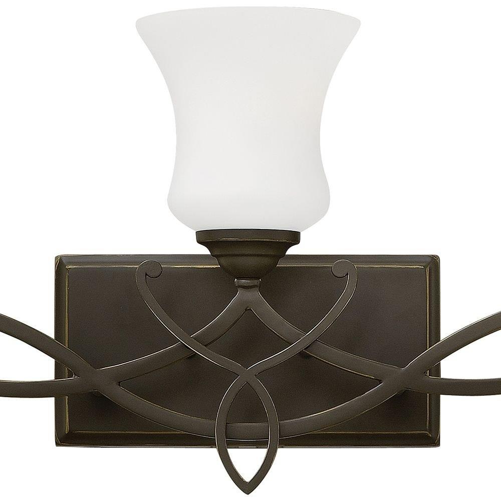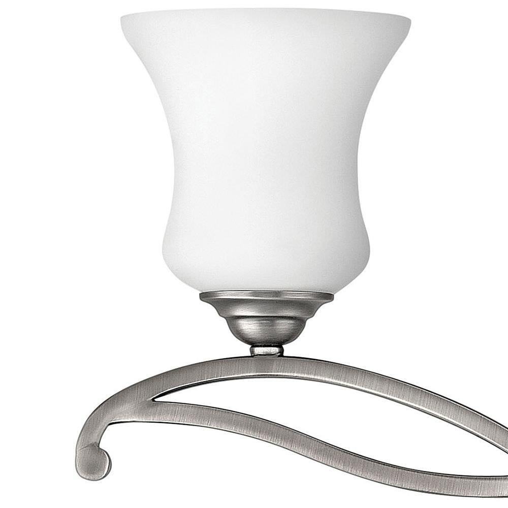 Brooke's updated traditional look features a minimalist forged scroll design in Antique Nickel and Olde Bronze that elegantly complements its etched opal glass.