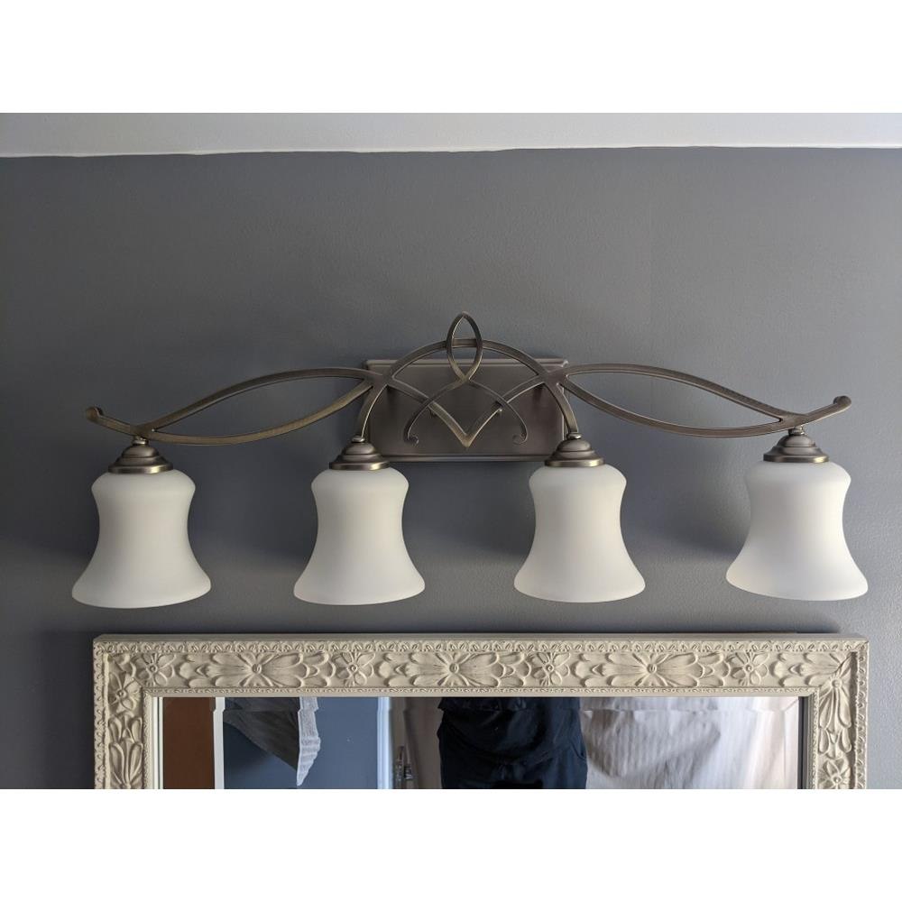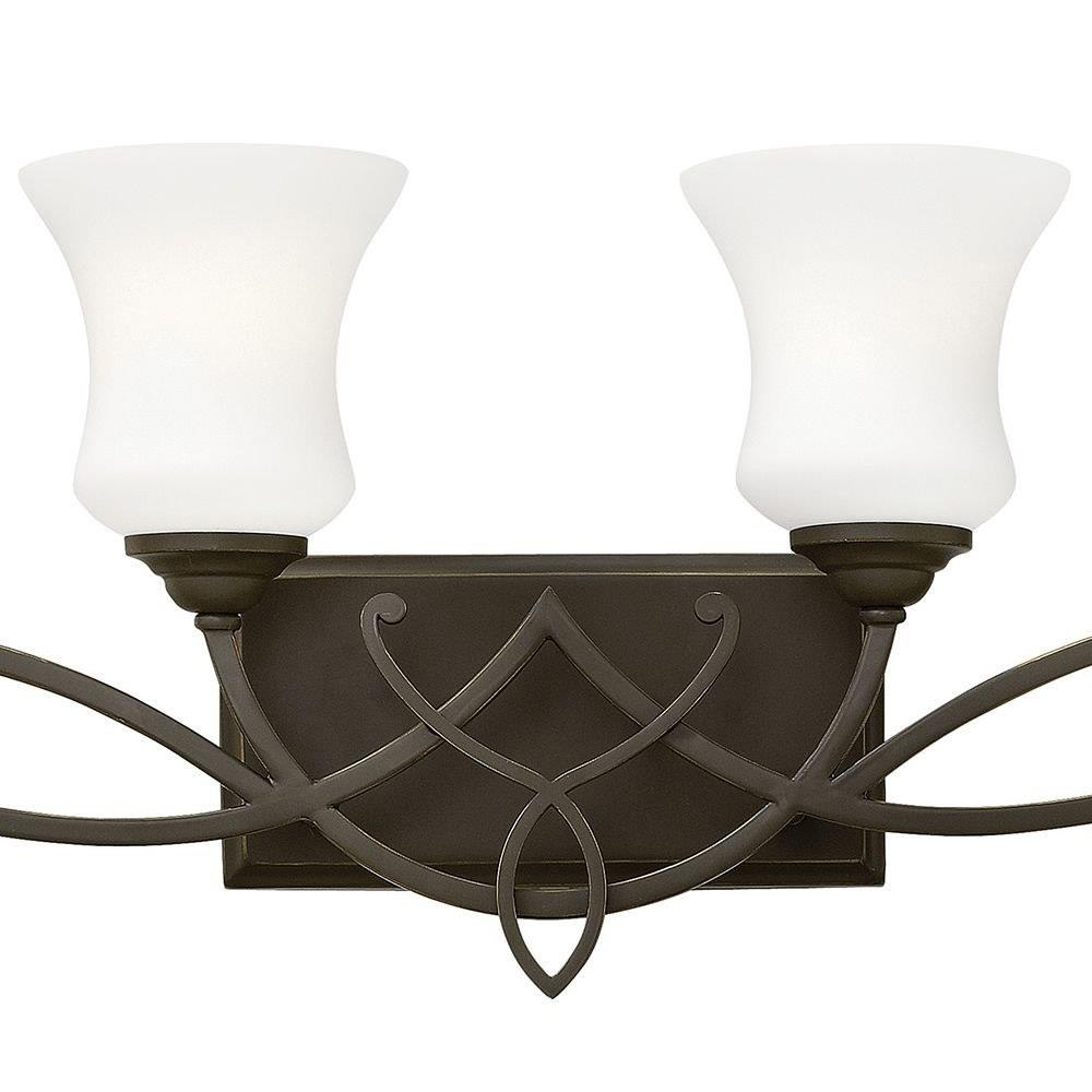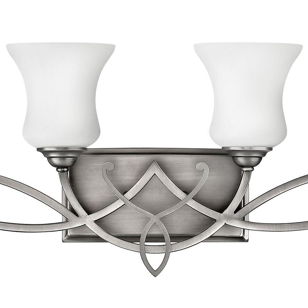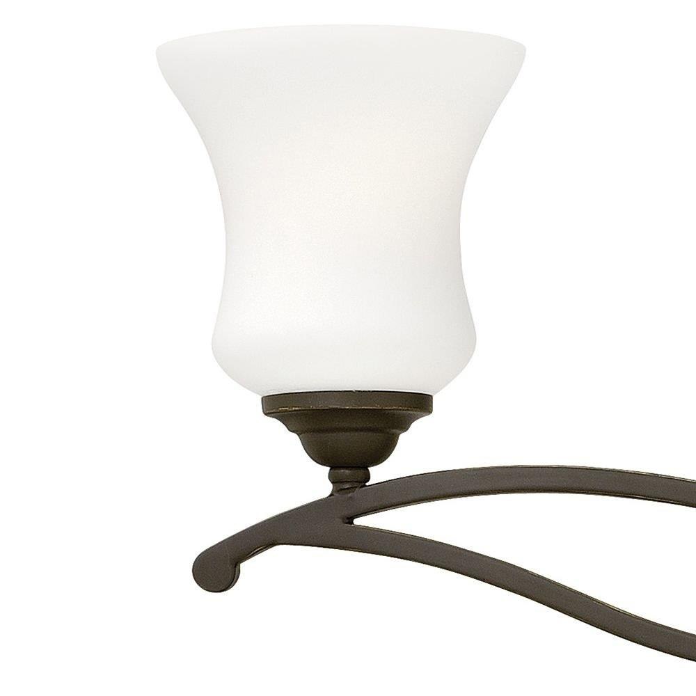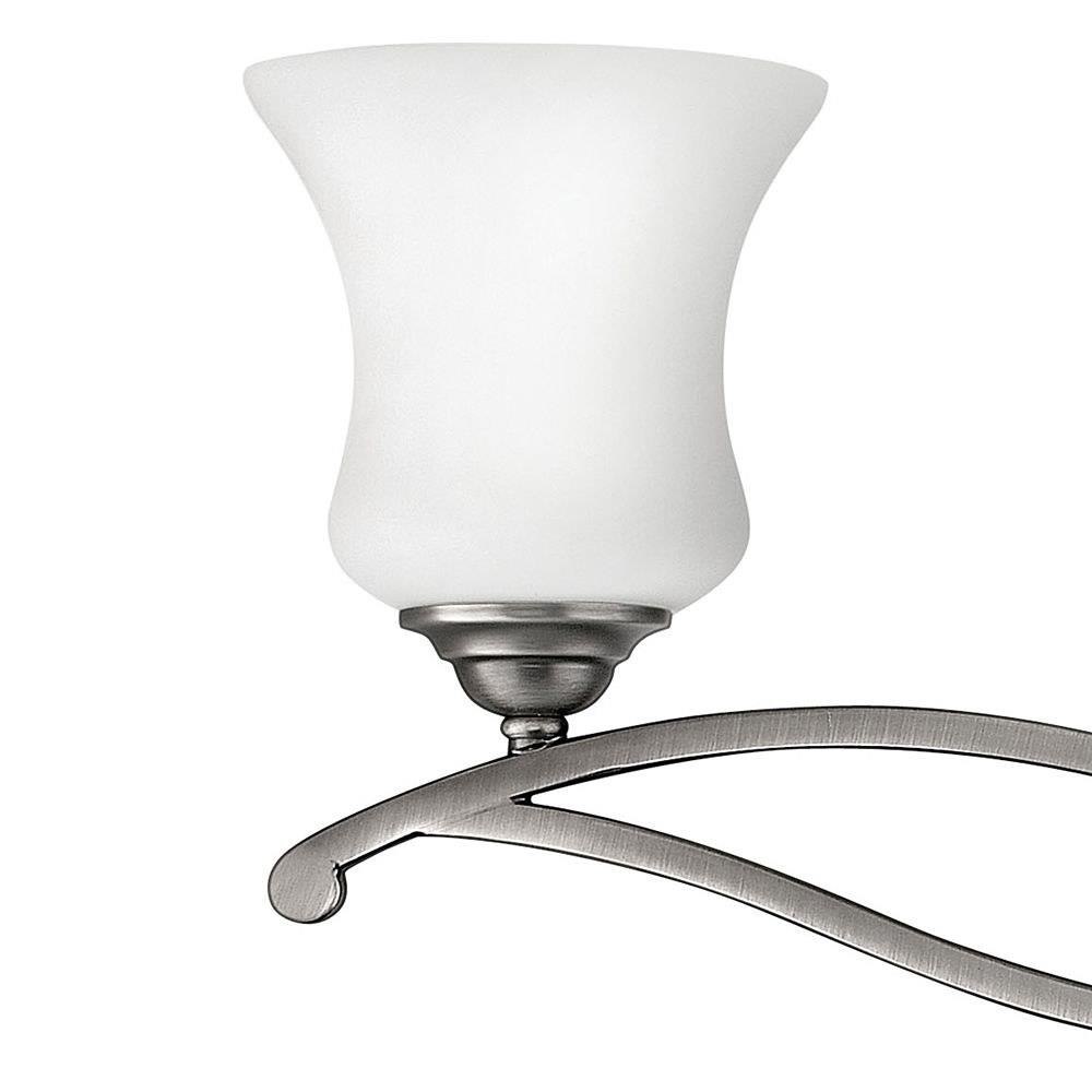 Brooke's updated traditional look features a minimalist forged scroll design in Antique Nickel and Olde Bronze that elegantly complements its etched opal glass.