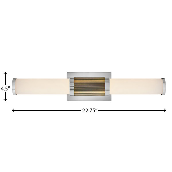 This integrated LED bath bar pairs sleek modern lines with timeless materials. A ribbed cuff in warm brass tones centers an etched opal glass baton, framed by polished metallic accents. Perfect for vanities and bath spaces, it can be mounted horizontally or vertically. ADA compliant and damp rated, it offers 2000 lumens of bright, high-CRI light, fully dimmable for customizable illumination, all with hidden hardware for a flawless finish.