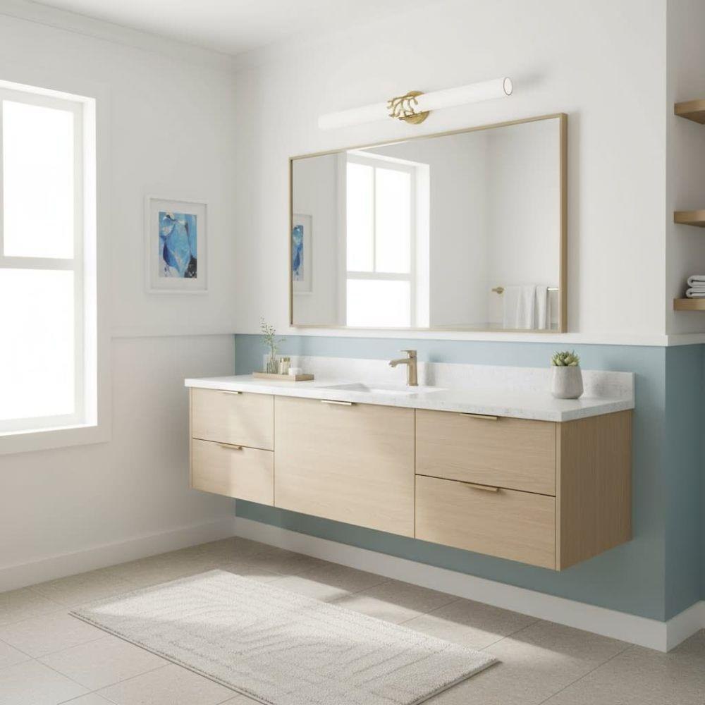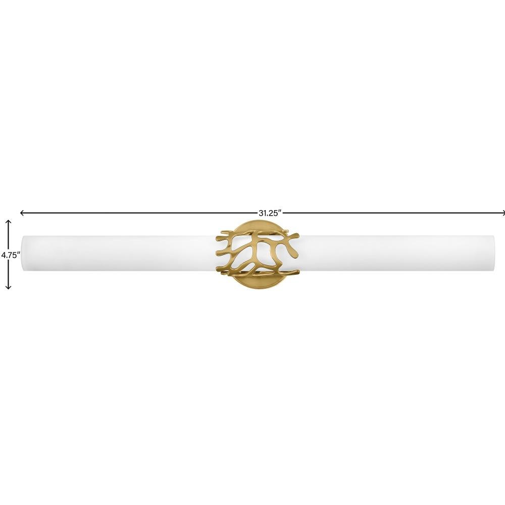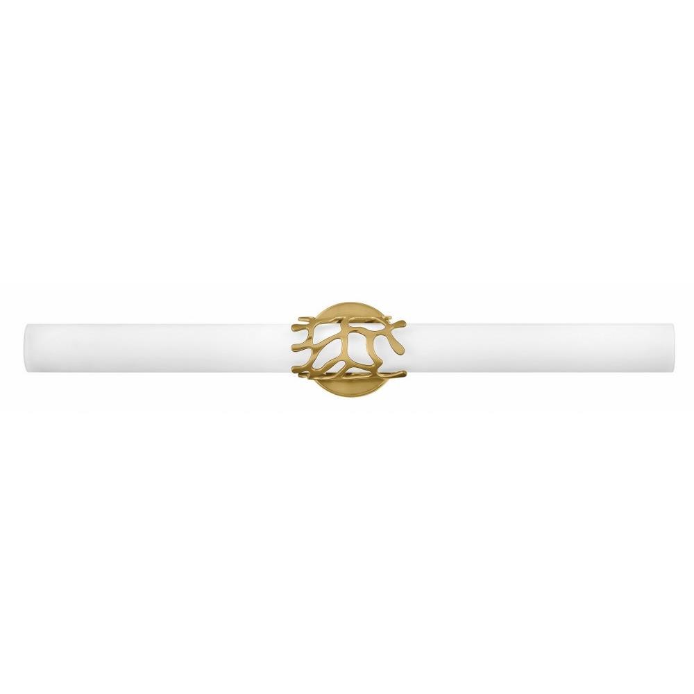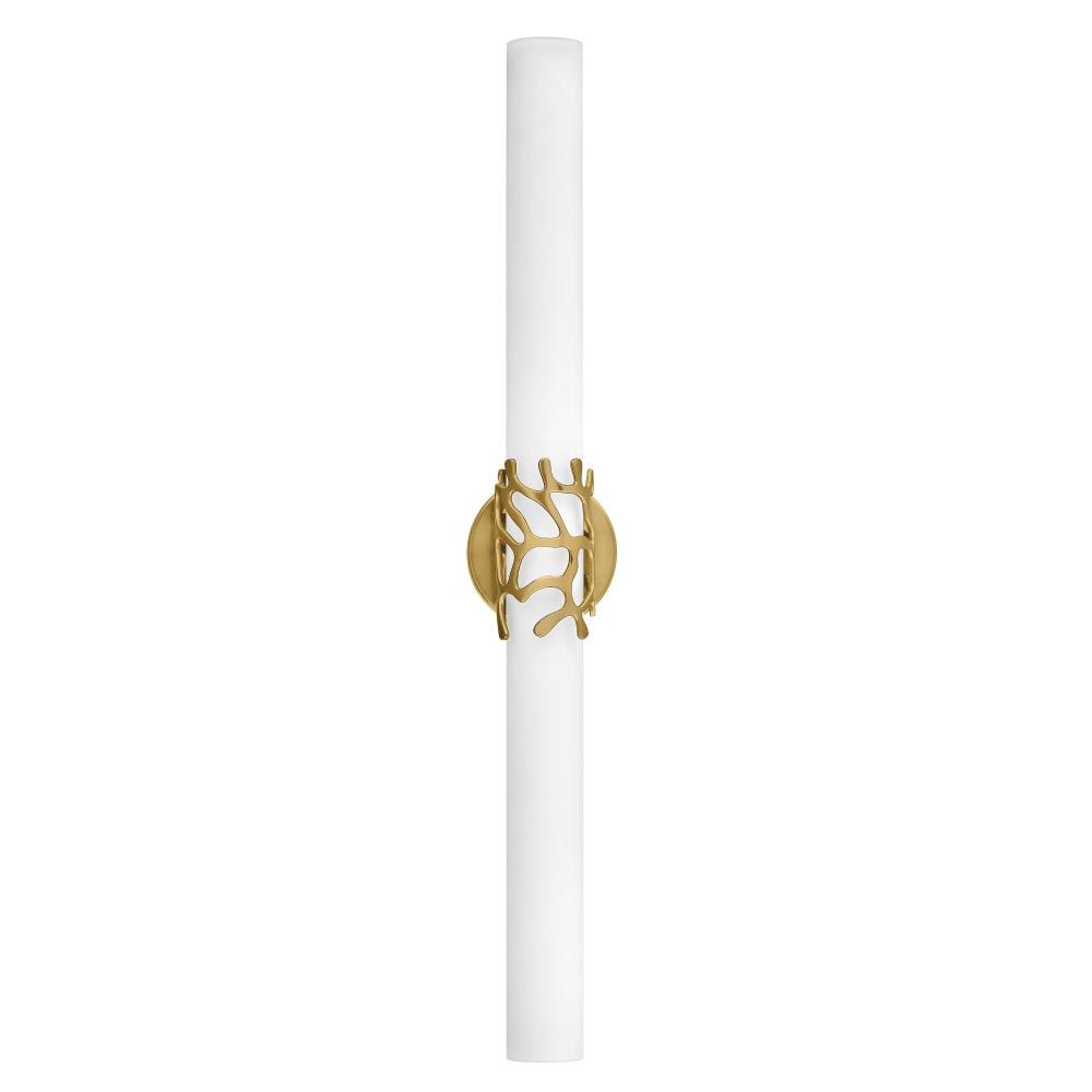 Projecting a sense of maritime wonder, Lyra embraces modern technology without sacrificing its timeless coastal allure. An eye-catching die-cast coral bracelet centers the design and wraps etched opal glass. The transitional silhouette can be mounted horizontally or vertically with an unseen Invismount system that showcases the clean, elegant look. Offered in a variety of finishes, Lyra is sure to embellish any space.Classic gleaming light brass finish / Suitable for use in damp locations as defined by NEC and CEC. Meets United States UL Underwriters Laboratories & CSA Canadian Standards Association Product Safety Standards / LED components carry a 5-year limited warranty / Meets California Energy Commission 2013 & 2016 Title regulations/JA8 / Fixture can be mounted horizontally or vertically / Crisp, minimal design with elegant details make a fresh, modern impact / Fixture is ADA compliant and adheres to the standards and guidelines listed by the Americans with Disabilities Act / Mounting hardware is hidden on the backplate to ensure a clean silhouette